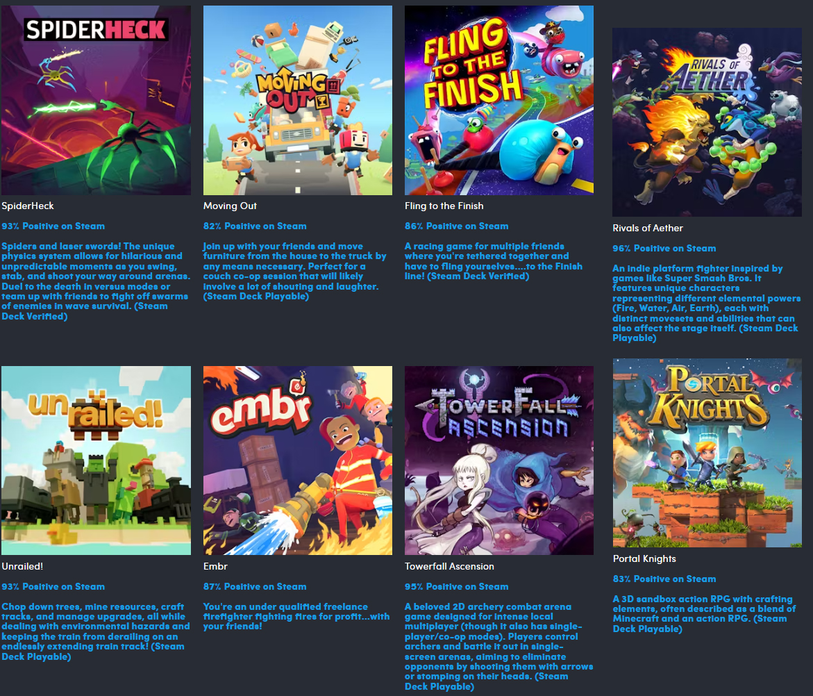 - Towerfall Ascension - an up to 4-player local party game that has won multiple awards. It's worth $14.99, has the Steam Deck Playable tag, and was released in 2014.