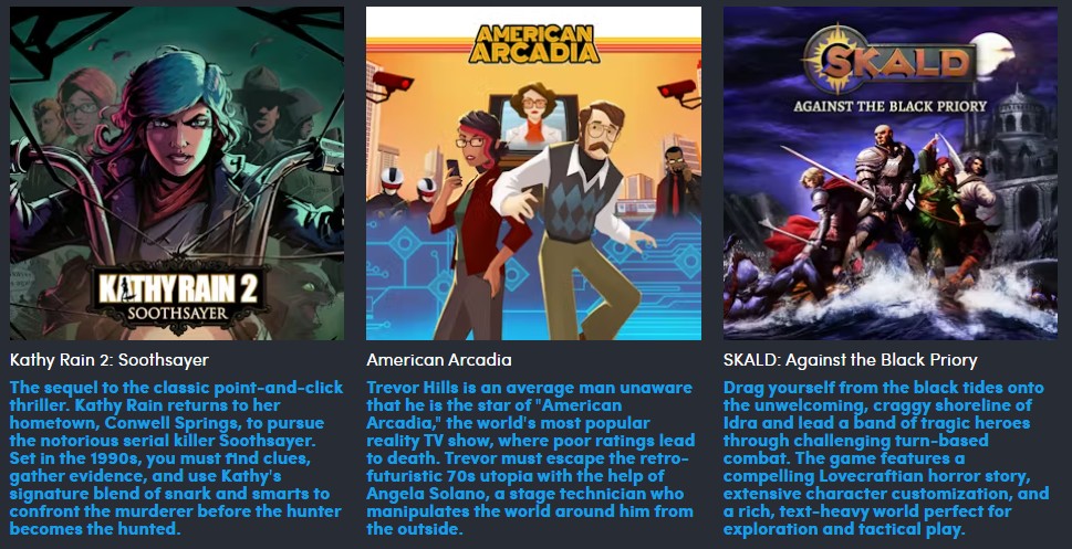 - Kathy Rain 2: Soothsayer - a 2025 sequel to the first point-and-click entry of the series. This Steam Deck Playable game currently features a 96% positive player rating and usually goes for $19.99.