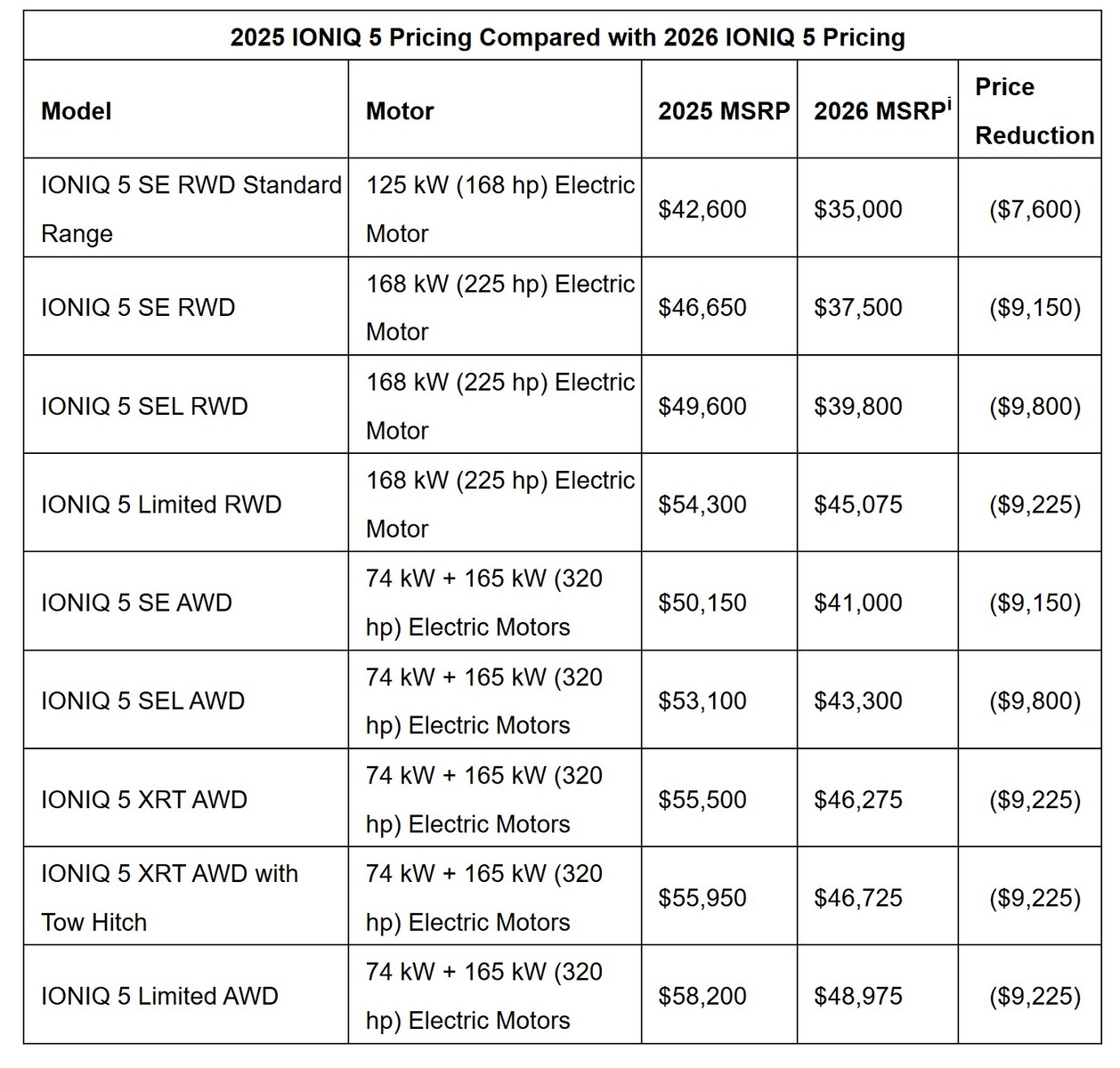 The 2026 Ioniq 5 SUV with Tesla NACS port that doesn't need a Lectron adapter to top up at Superchargers, for instance, gets a massive price cut of up to $9,800, for a starting tag of just $35,000 for the base RWD model.