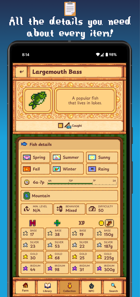 BlueCaret’s Stardew Valley app lets players easily track their in-game progress from their smartphone. It features a complete item database, guides for both the Community Center and Joja routes, detailed gift preferences for all villagers and neatly organized collection lists. Additional tools are available with the premium upgrade, which costs a one-time fee of $5.99. These include a perfection tracker, notes, a calendar, to-do lists and support for managing multiple farms.