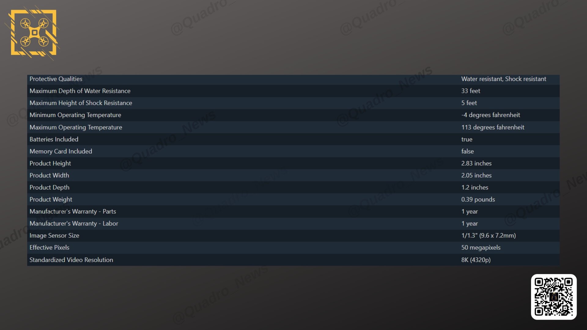 Newly leaked specifications from @Quadro_News reveal an extensive list of details about the soon-to-be-launched Insta360 Ace Pro 2 action camera, further expanding on earlier leaks that confirmed features like 8K video, a Leica co-developed sensor, and dual AI chips. The camera will allegedly offer water resistance up to 33 feet and shock resistance from 5 feet. It is rated to function in temperatures ranging from -4°F to 113°F, making it usable in both cold and hot environments. Take a look at the leaked spec list below: