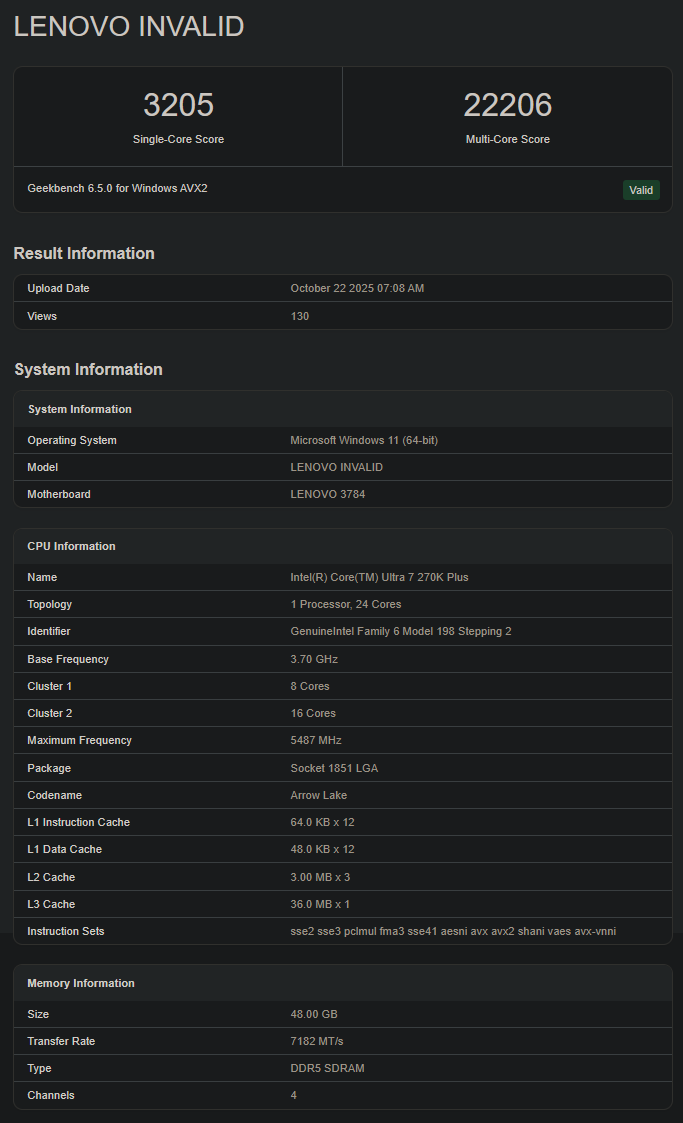 It scores 3,205 and 22,206 in Geekbench 6.5's single and multi-core tests, respectively. The Core Ultra 7 270K Plus has 24 cores (8 P + 16 E), 24 threads and a boost clock of 5.4 GHz. It powers an unspecified Lenovo PC with 48 GB of DDR5-7182 (DDR5-7200) RAM running Windows 11. Geekbench's back-end reveals it was tested alongside a GeForce RTX 5090 D, a China-only GPU.