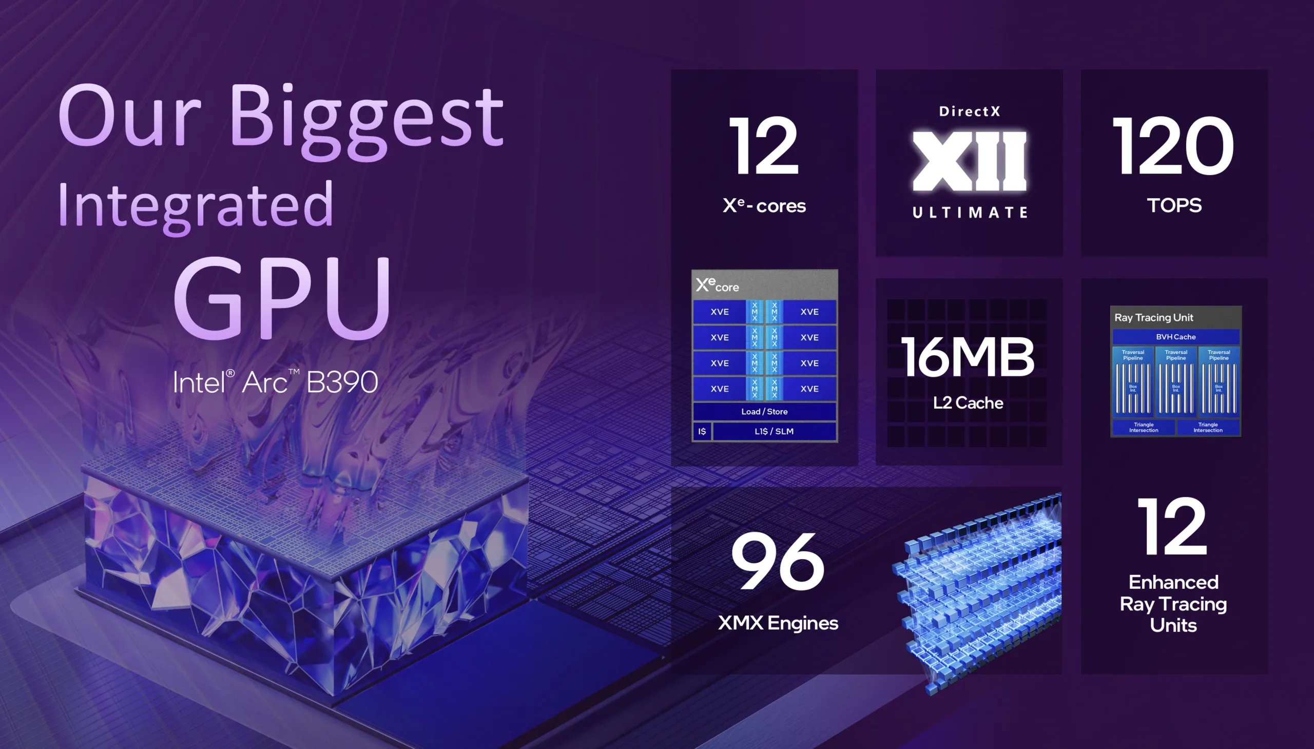 The new GPU tile of the B390 now offers twice as much L2 cache (16 MB) and the two render slices each consist of six Xe cores.