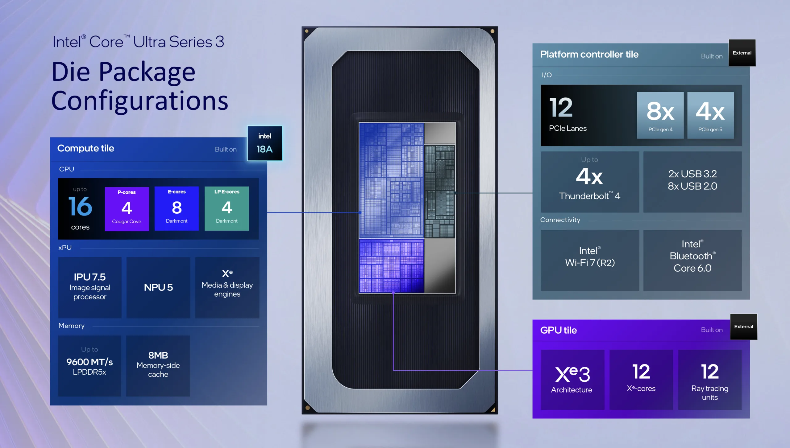 The new Panther Lake mobile processors are once again made up of different tiles, with the compute tile being produced by Intel itself (Intel 18A). Depending on the model, up to 16 cores in total can be used: four fast P-cores (Cougar Cove), eight E-cores (Darkmont), and four additional low-power E-cores (Darkmont). NPUs with 46-50 TOPS are also installed, meaning that all Panther Lake processors meet the minimum requirement for Microsoft's Copilot+ certification. TSMC manufactures the other two tiles (the platform controller and the GPU).