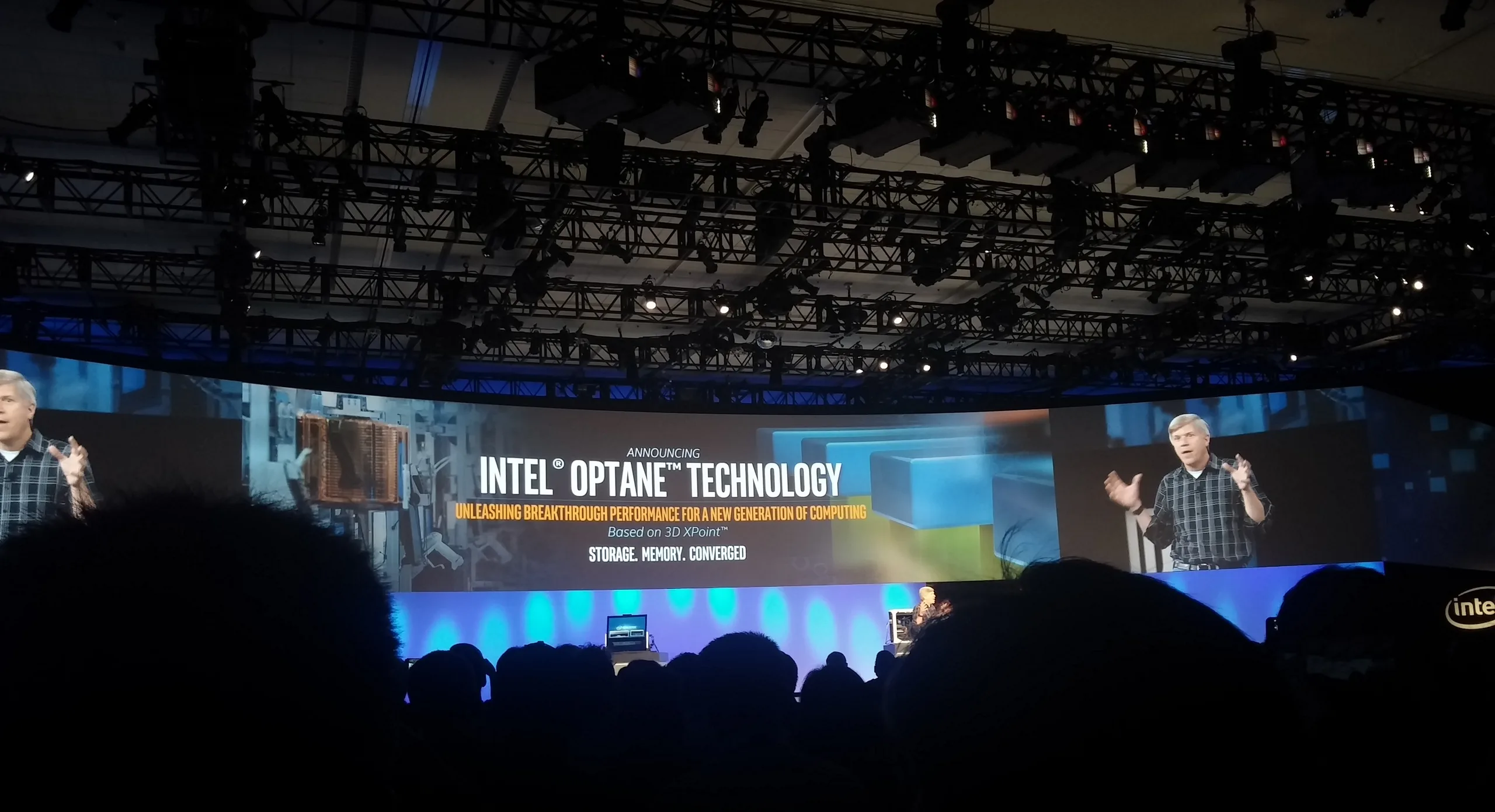 During the first keynote of the day, Intel took a brief few minutes to introduce the Optane SSD based on new 3D Xpoint memory technology co-developed with Micron. Its method of storage is different from both magnetic platters of hard drive disks and NAND flash of solid-state drives. As Intel notes, this is the world's first completely new storage technology since the introduction of NAND 25 years ago.