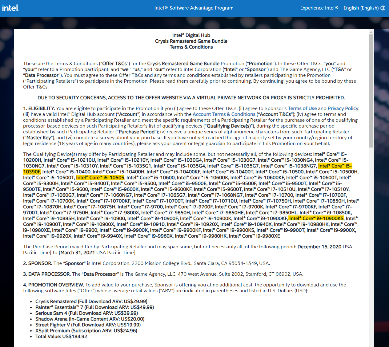 Some unreleased Comet Lake-S processors have been revealed, and by none other than Intel. Referenced in an Intel Software Advantage Program document, the CPUs are part of a broader list of Intel processors qualifying for the Crysis Remastered Game Bundle. As far as we can tell, the list contains three unreleased Comet Lake-S processors, the Core i5-10390F, Core i5-10505 and the Core i9-10900KS.