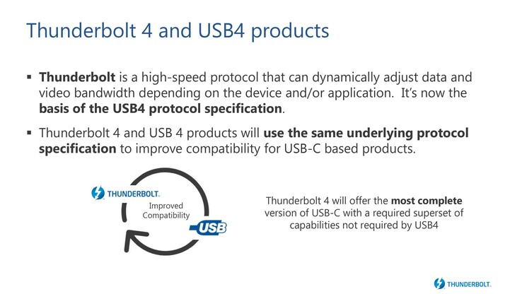 Back during Computex 2019, Intel talked about integrating the capabilities of Thunderbolt 3 into the USB4 specification. Later that year, the USB4 spec was finalized with an aim to lessen the confusion between various USB types and allowing use of a standard USB Type-C connector. Today, Intel is officially taking wraps off the Thunderbolt 4 (TB 4) standard. Thunderbolt 4 will now be the basis for the USB4 protocol while also offering a few additional features on top of the standard USB4 spec.