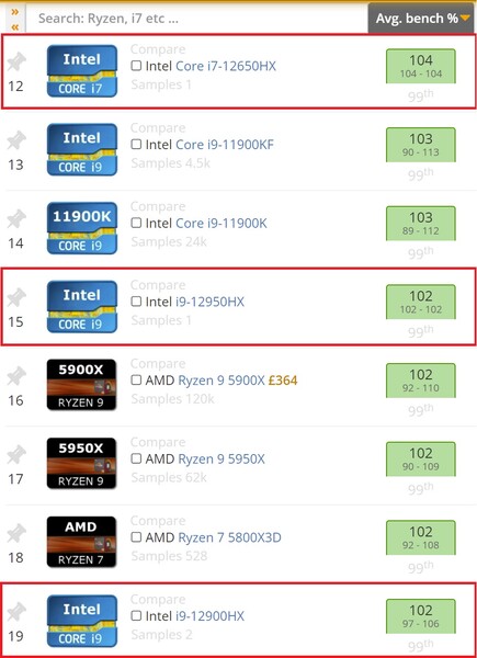 Surprisingly, it is the Intel Core i7-12650HX that strikes the highest blow, slotting into 12th place in UserBenchmark’s average bench chart (and yes, that is higher than the AMD Ryzen 9 5900X and Ryzen 7 5800X3D but ‘nuff said). The 14-core, 20-thread mobile part scores 104% while the 16-core, 24-thread i9-12950HX and i9-12900HX have to settle in 15th and 19th positions, respectively, on 102%. It seems this state of affairs is simply down to the i7 processor being able to achieve a higher average clock rate during testing thus producing better 1-core and 2-core results. The i7-12650HX managed 4.05 GHz average turbo while all the i9 samples (three tested in total so far) were recorded at 3.6-3.8 GHz.