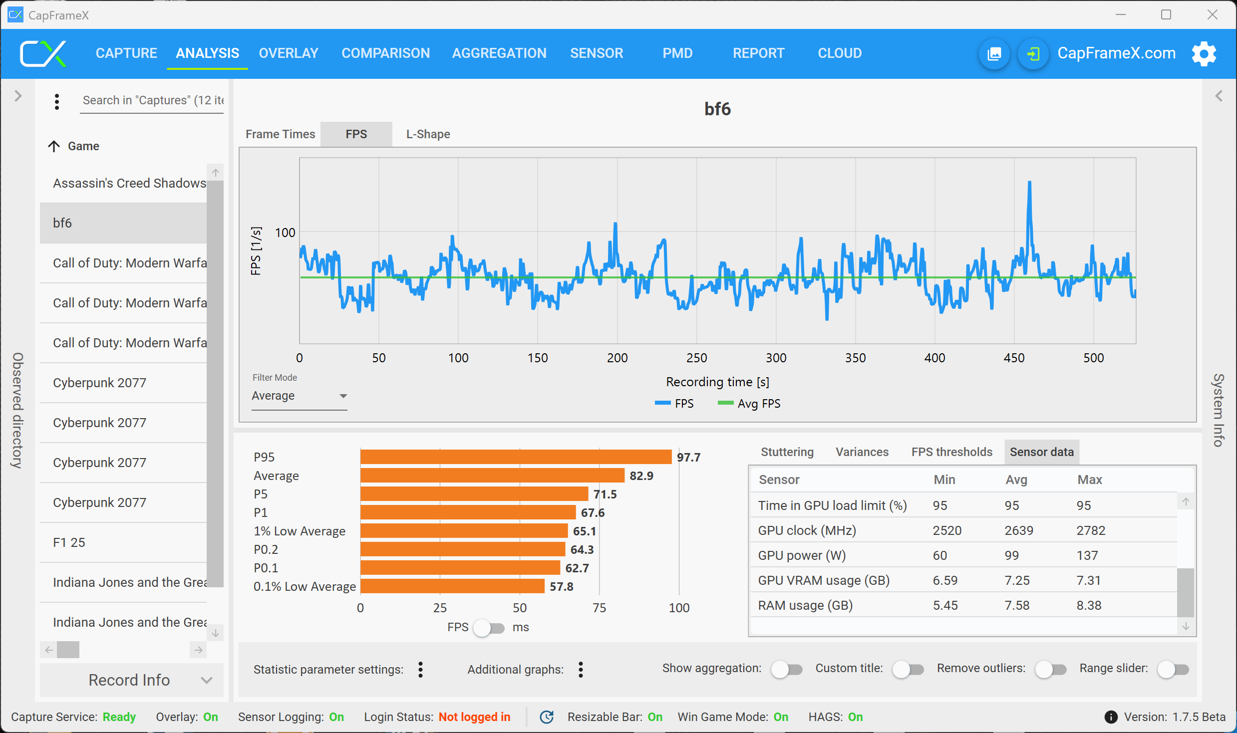 Battlefield 6 is an interesting case, because you can easily check the fps number (even distributed across CPU/GPU) and also the VRAM utilization with the integrated monitoring tools. We started in the Full-HD resolution and the preset Overkill, where the VRAM load starts at slightly below 7 GB.