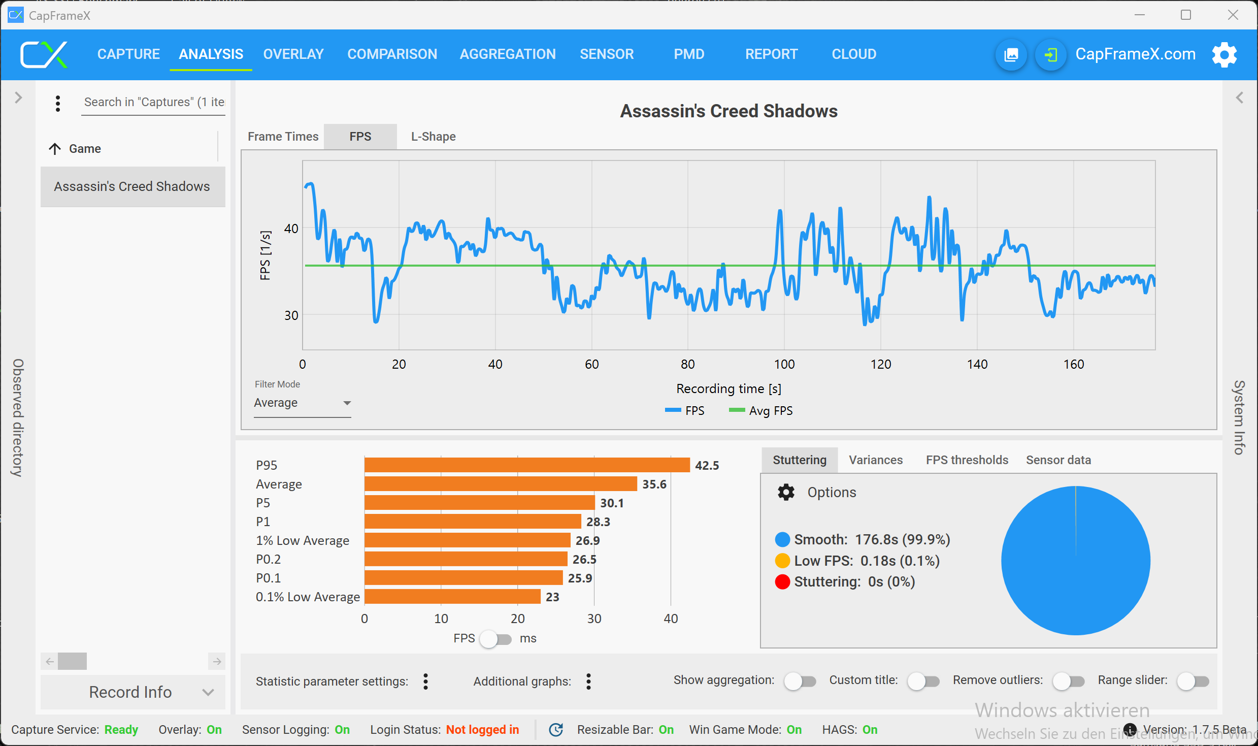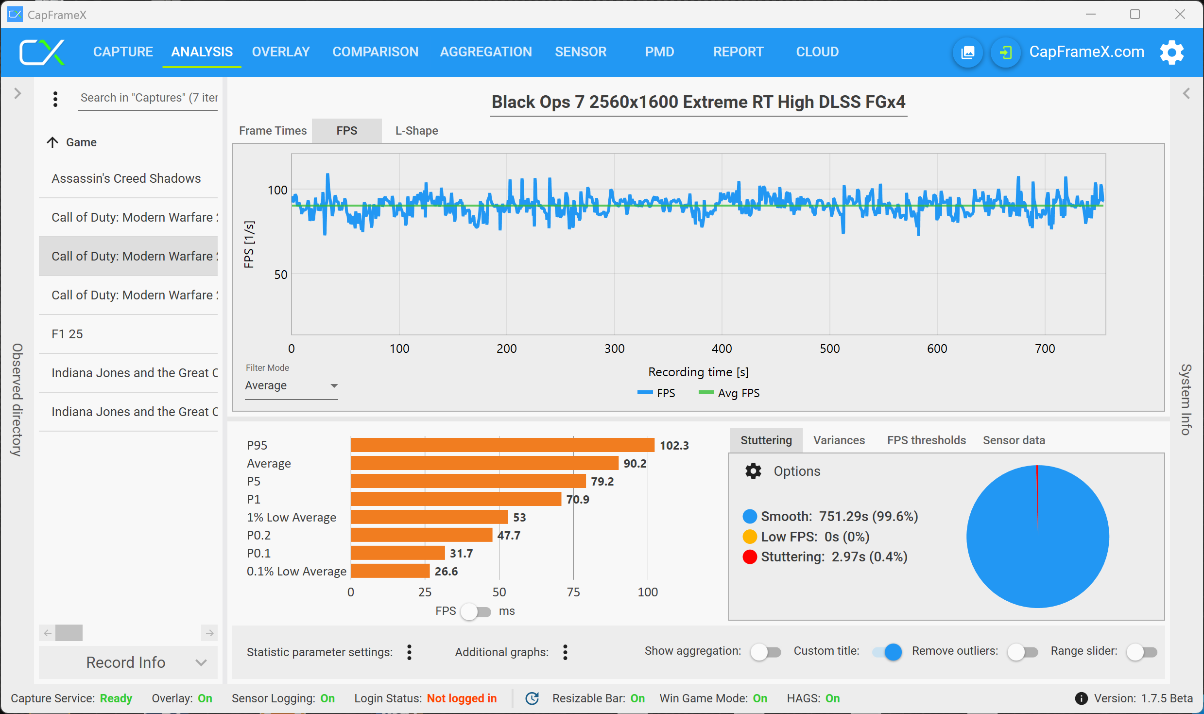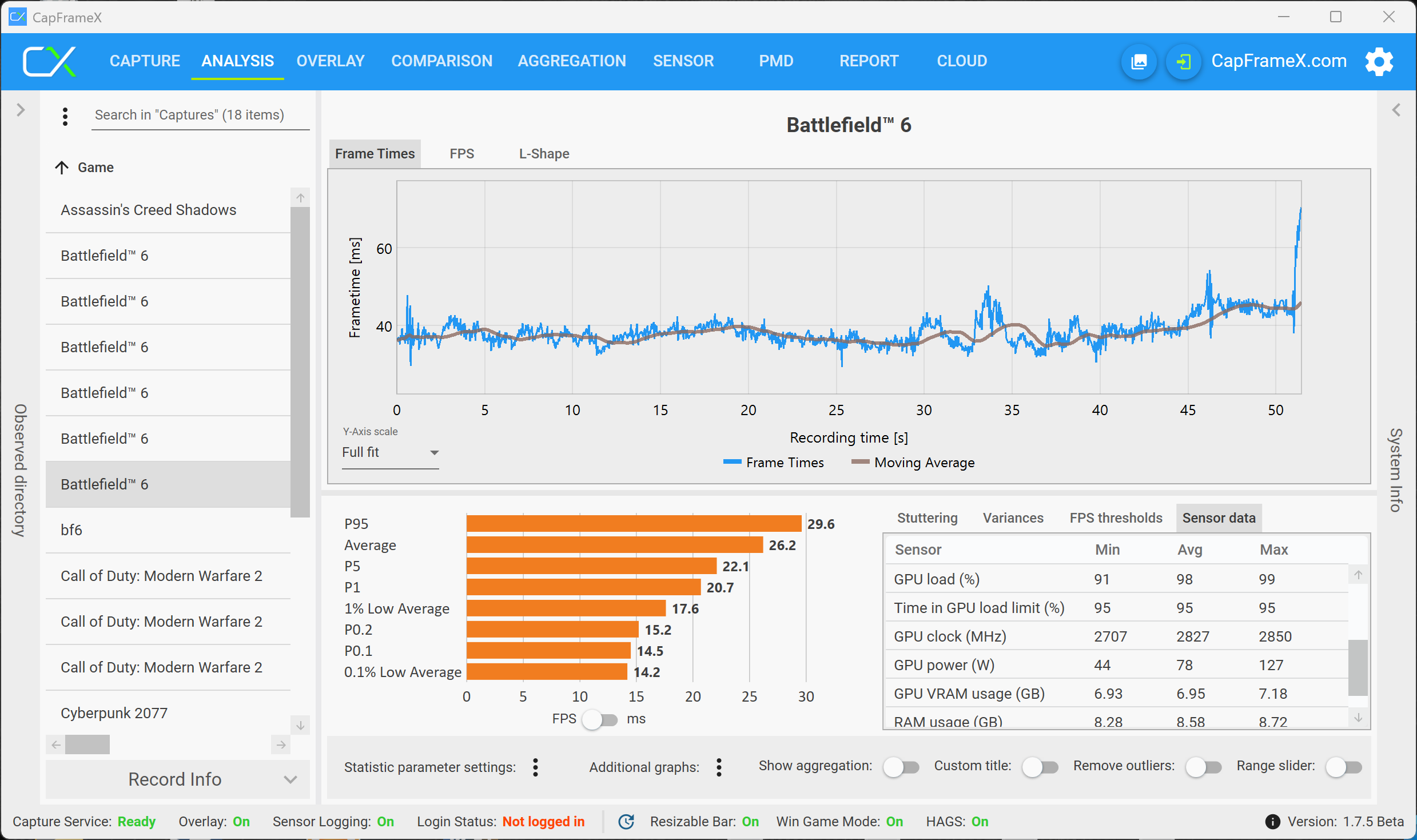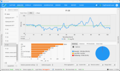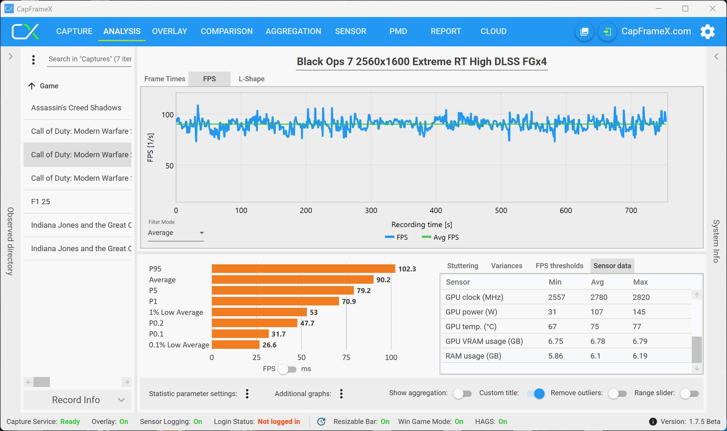 The fact that there is a VRAM warning, however, does not mean that you necessarily experience issues while gaming. With maximum load for the RTX 5070 (highest VRAM load, but still smoothly playable), we used the setting 2560 x 1600 pixels, Raytracing (High), DLSS and Frame Generation (QHD RT is not playable without DLSS, but at the same time 4K with RT is not always above 30 fps, despite DLSS and MFGx4) and played the multiplayer. As an example, the following analysis shows a multiplayer match, and it clearly shows that there are no limitations. The RTX 5070 Ti with 12 GB VRAM does not have any issues with the 4K resolution.