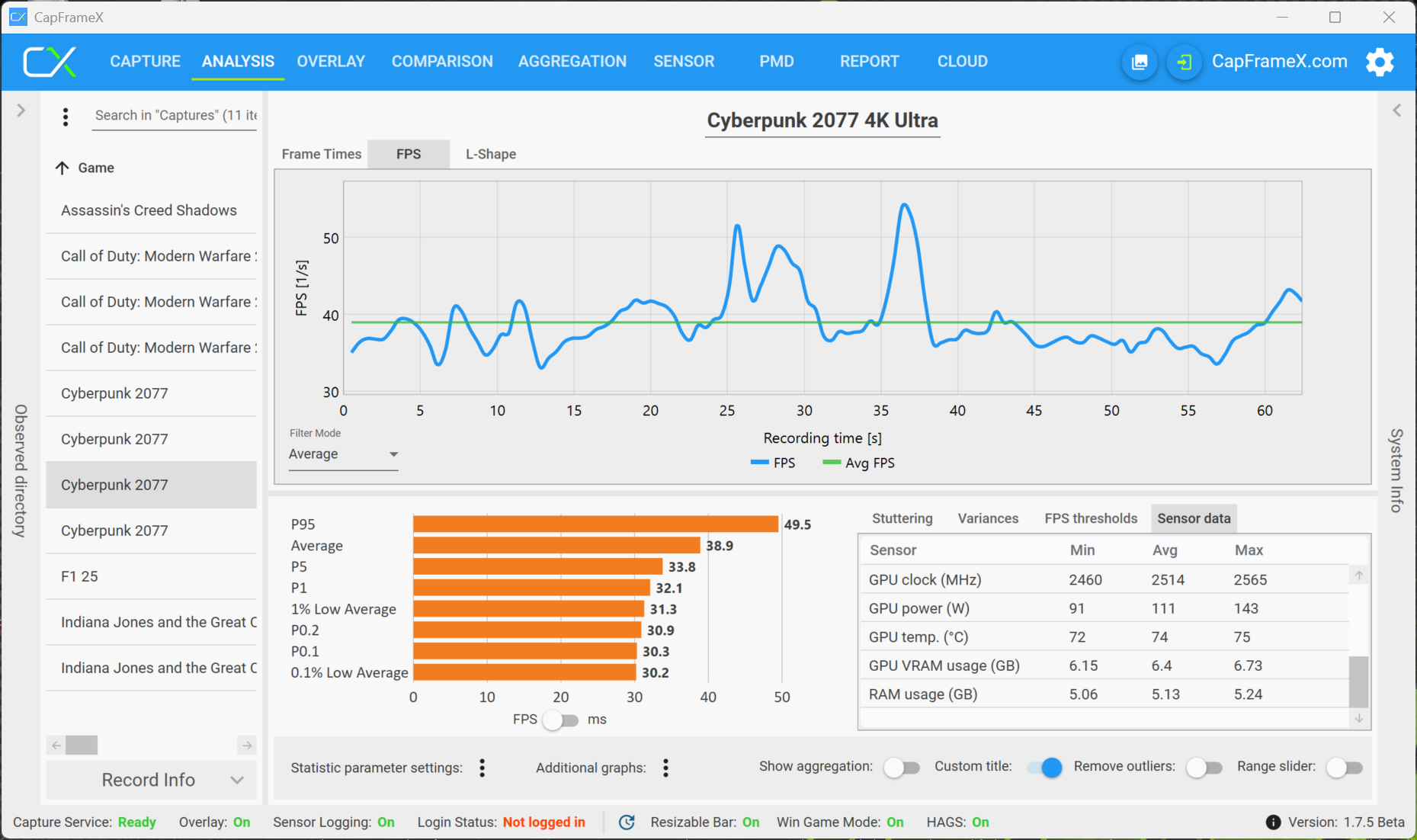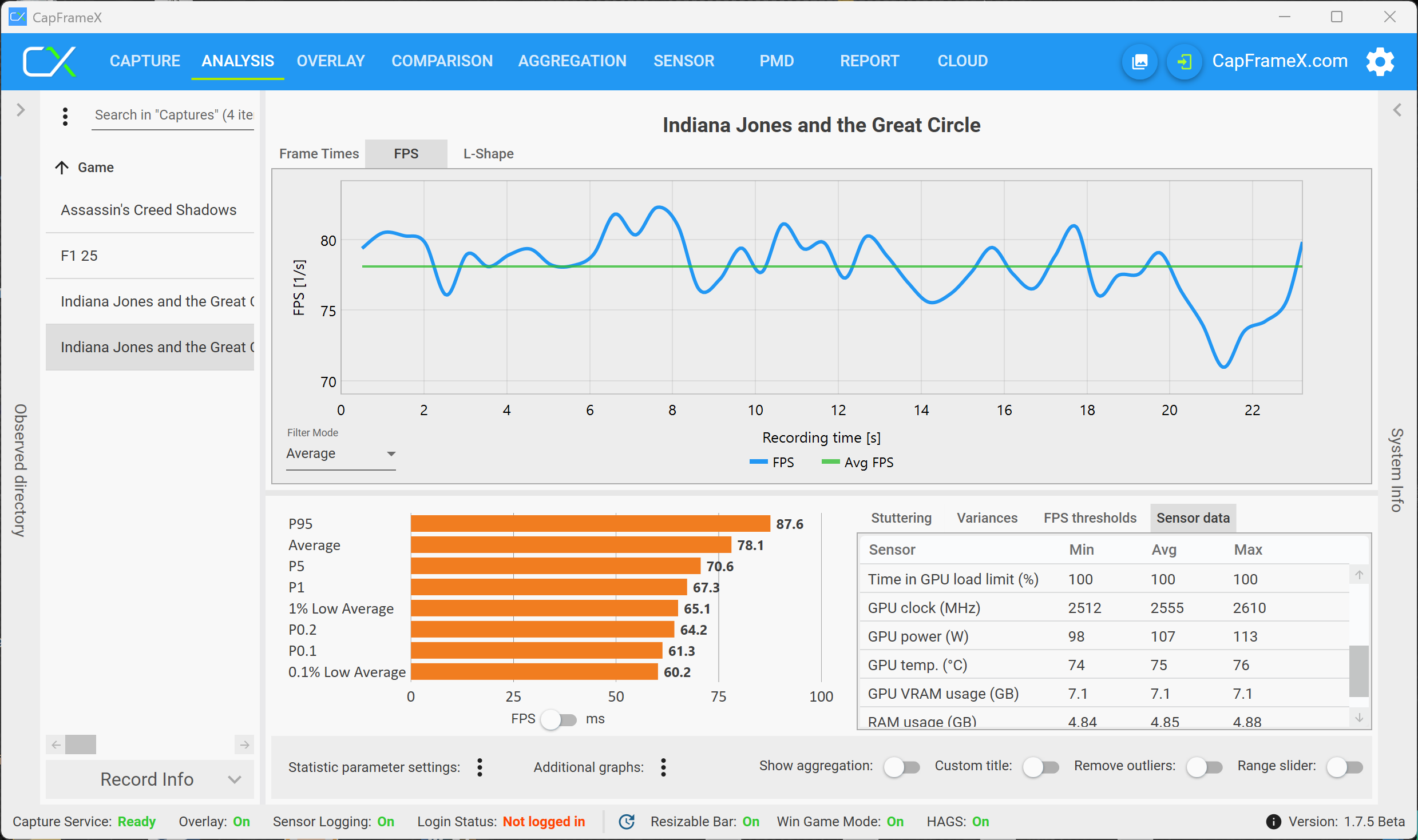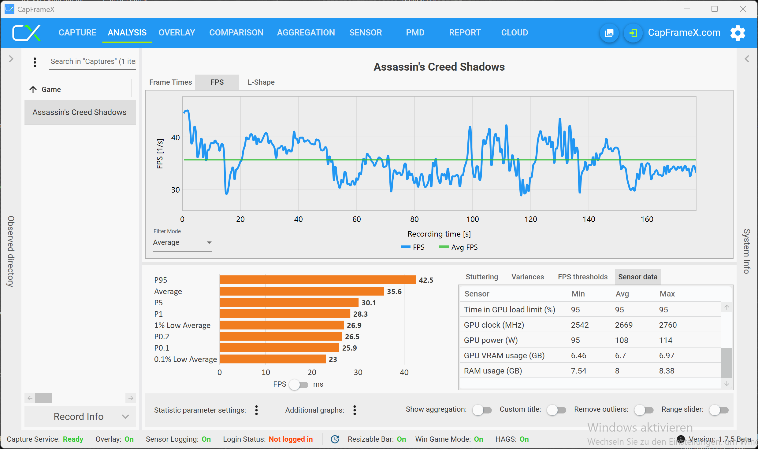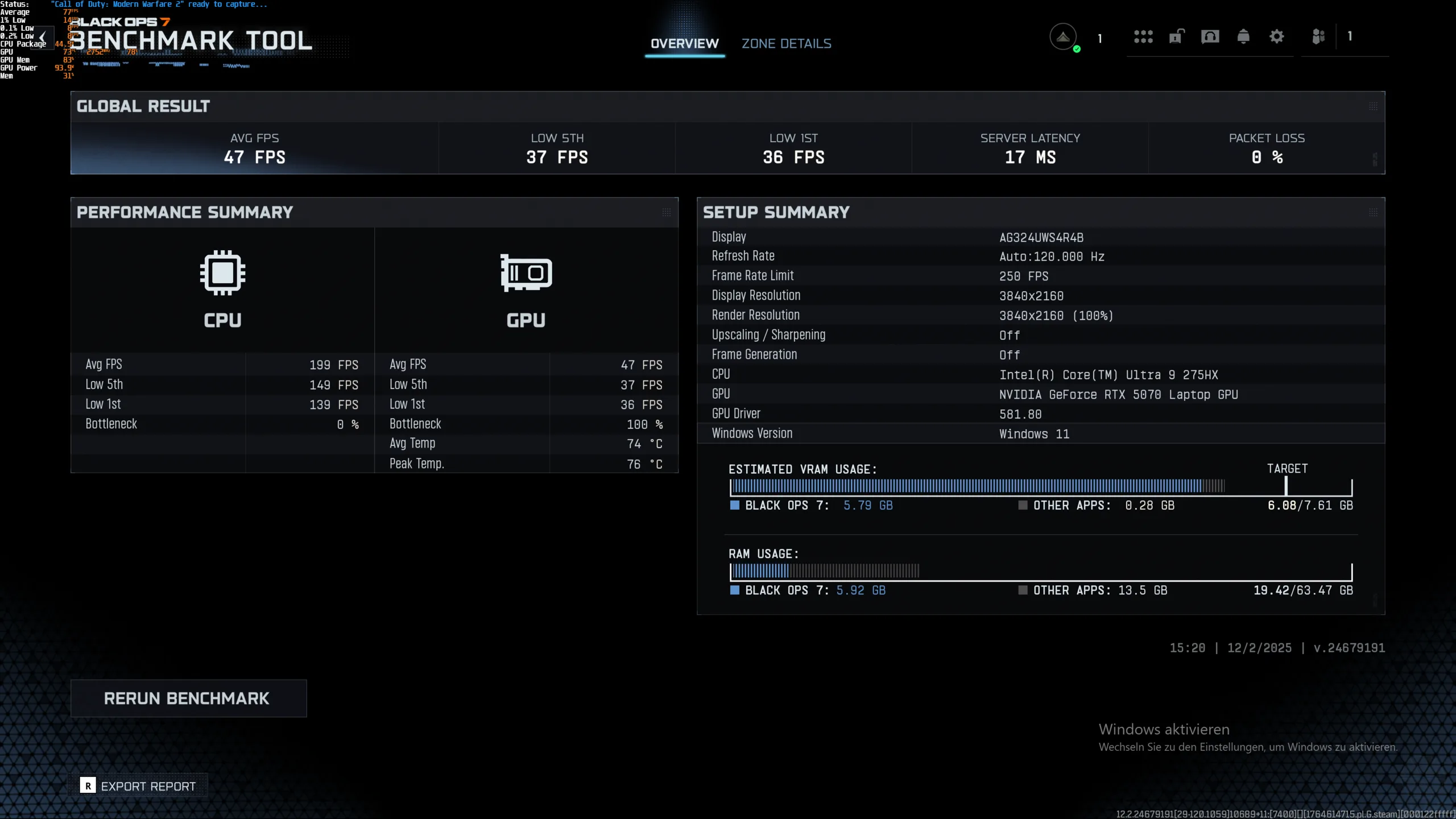 However, our main focus in this article is not the pure performance, but whether the available amount of VRAM results in limitations when you play games, like stutters or frame drops or performance losses when you play for longer periods. In addition to integrated benchmarks, we primarily recorded and analyzed the performance figures with the tool CapFrameX. We started our tests with the RTX 5070 Laptop (8 GB VRAM) and then switched to the RTX 5070 Ti Laptop with 12 GB VRAM when we noticed issues.