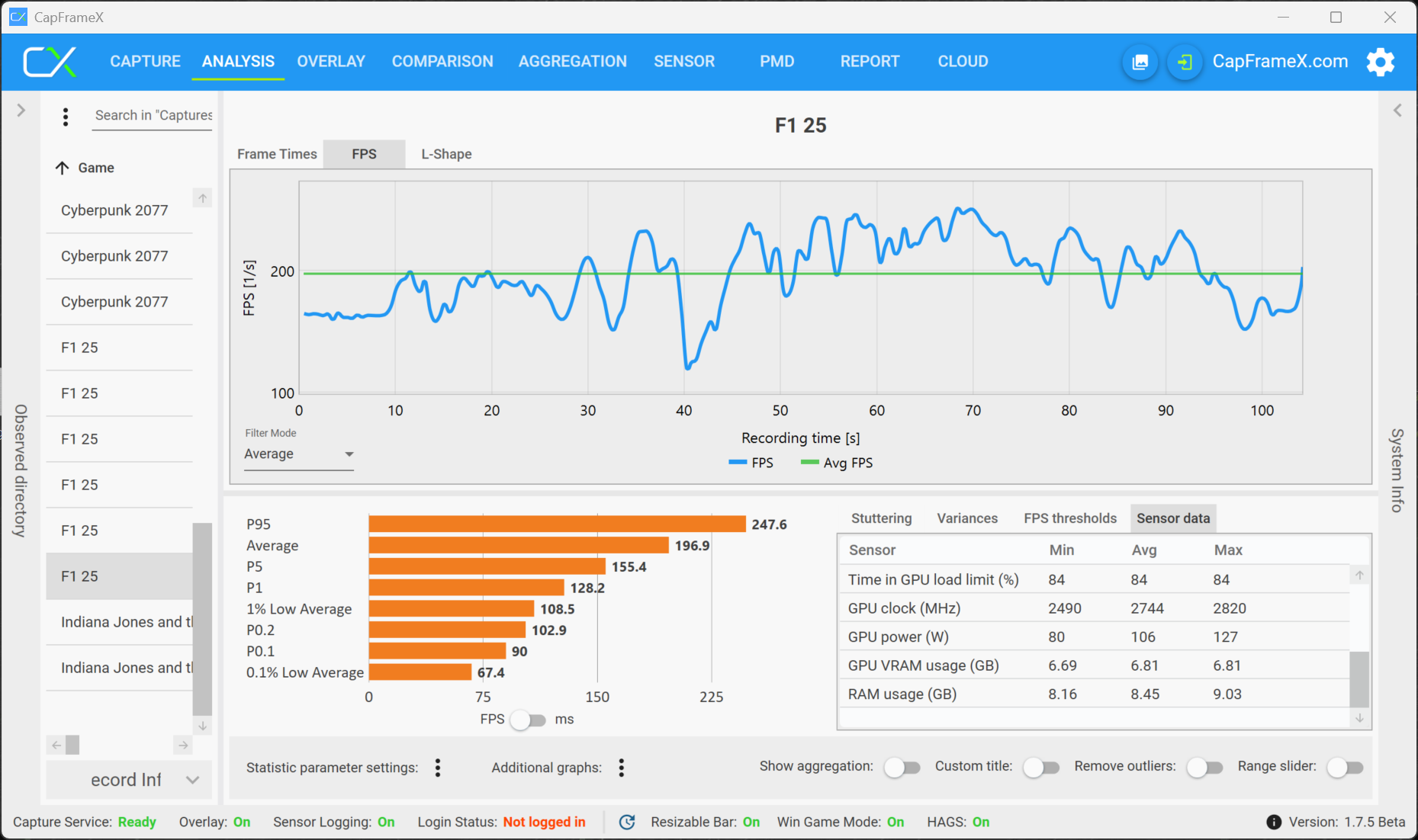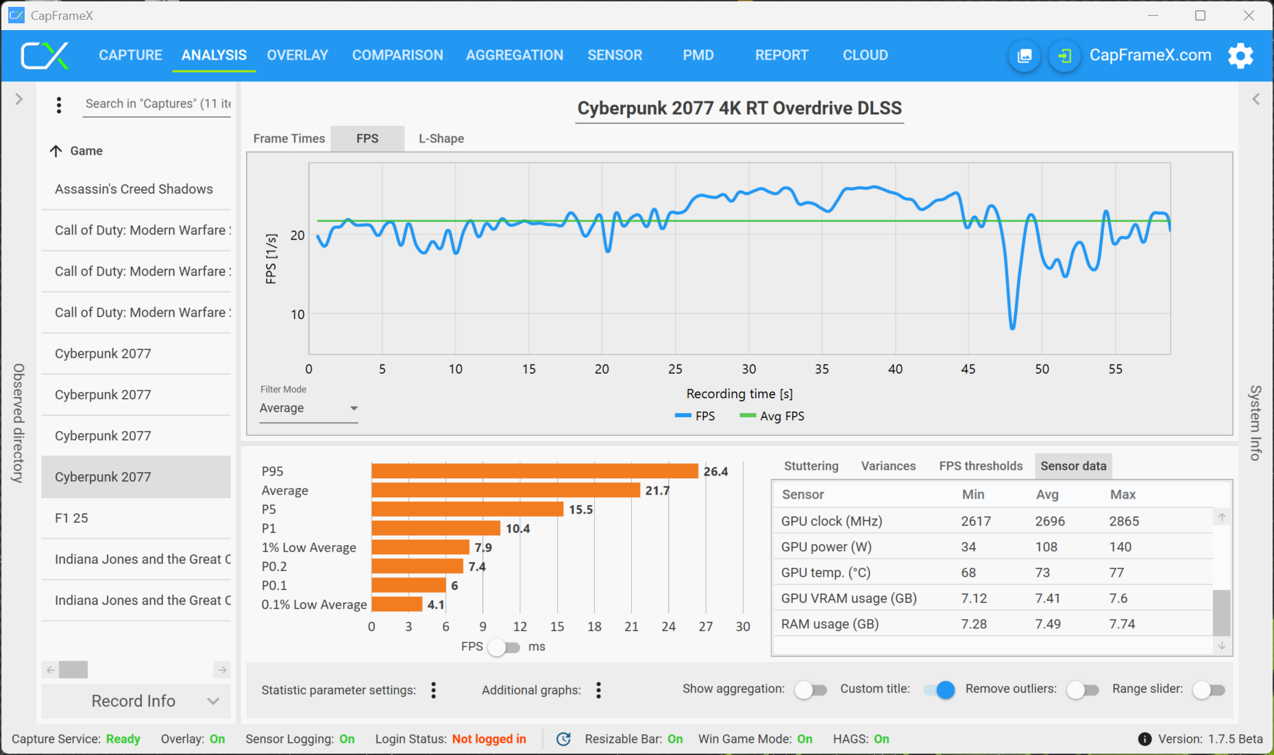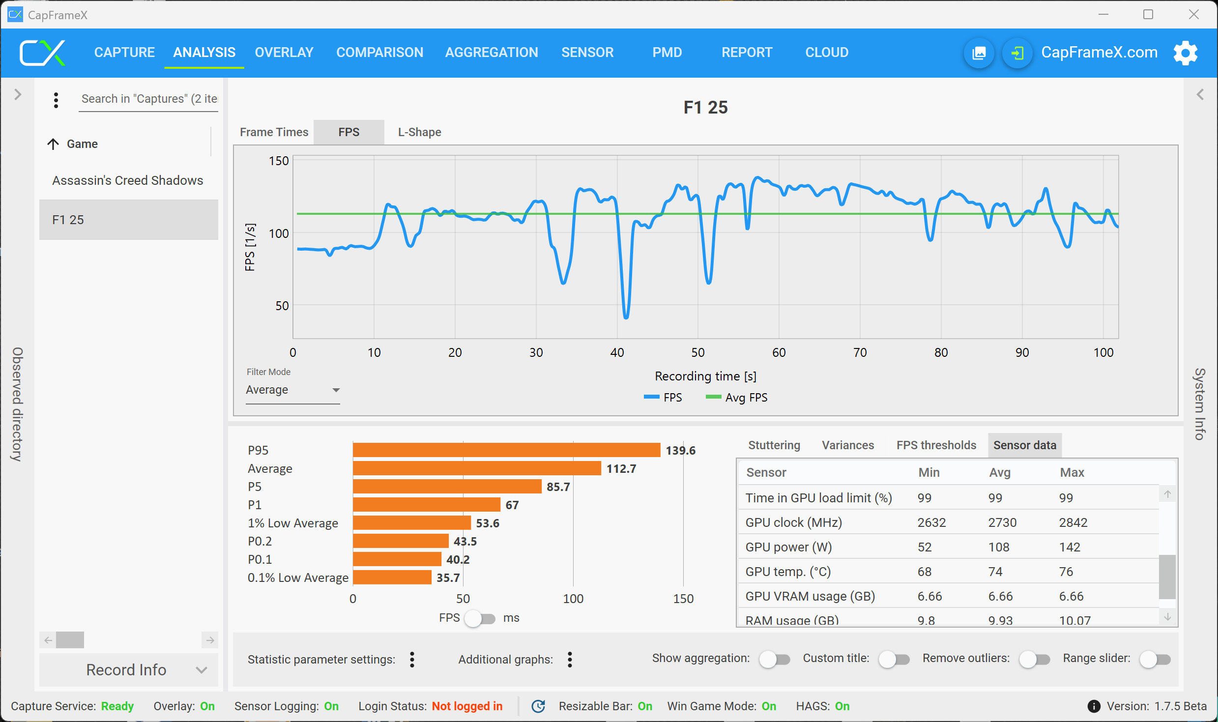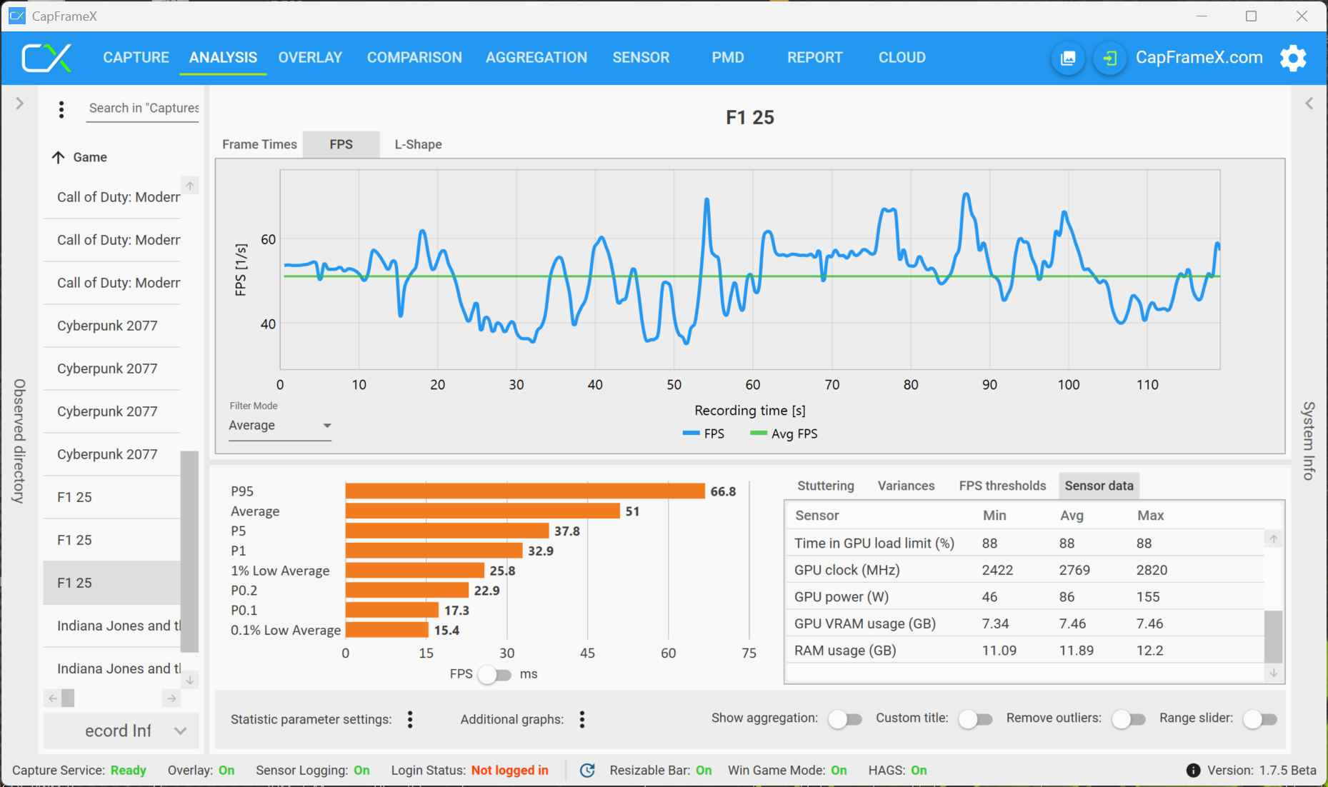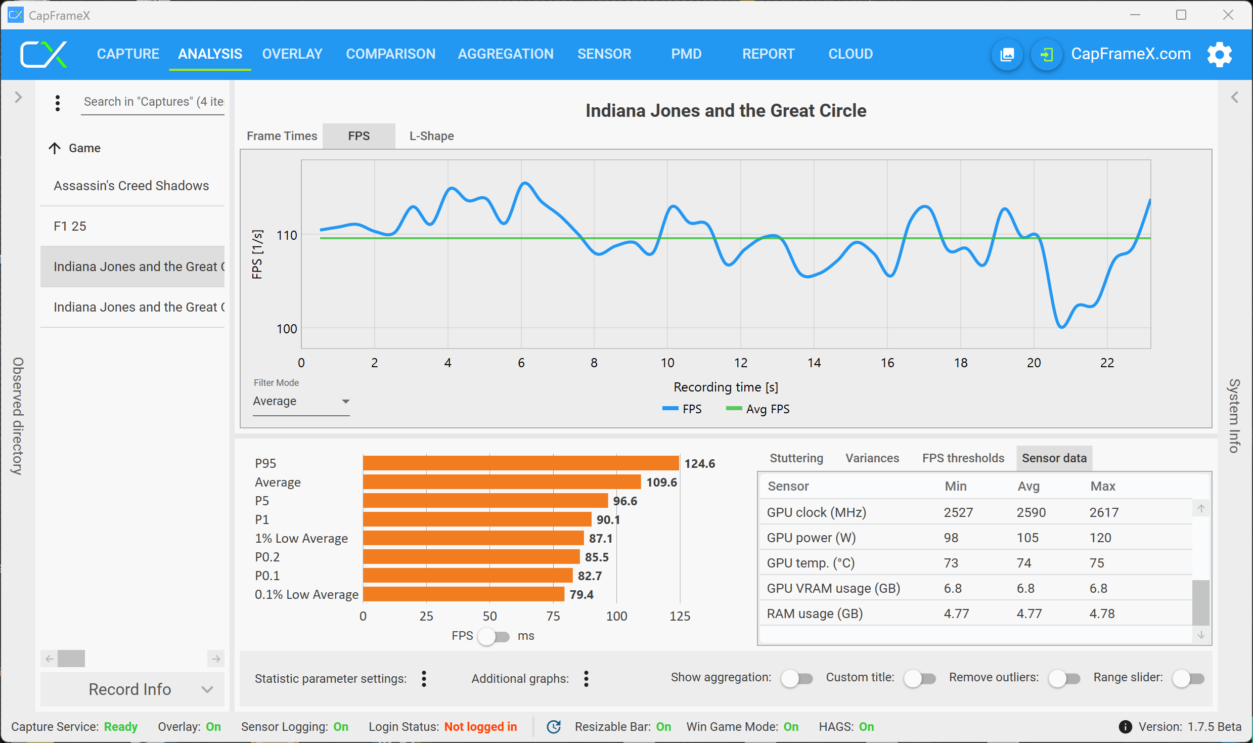 However, our main focus in this article is not the pure performance, but whether the available amount of VRAM results in limitations when you play games, like stutters or frame drops or performance losses when you play for longer periods. In addition to integrated benchmarks, we primarily recorded and analyzed the performance figures with the tool CapFrameX. We started our tests with the RTX 5070 Laptop (8 GB VRAM) and then switched to the RTX 5070 Ti Laptop with 12 GB VRAM when we noticed issues.