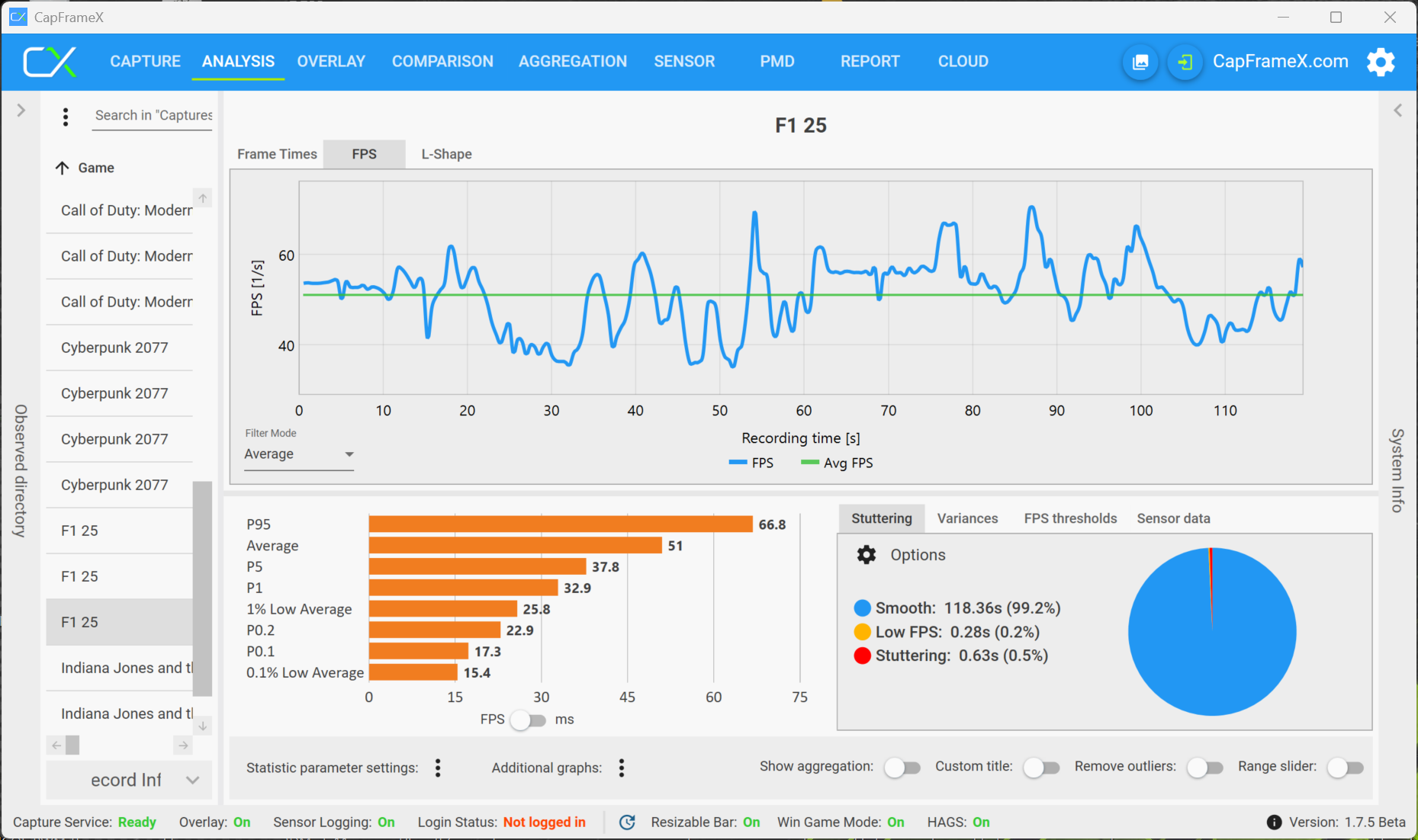 F1 2025 is a very demanding title and high graphics setting (starting from Ultra), where Raytracing is active by default, are also a challenge for high-end GPUs. To ensure smooth gameplay with the RTX 5070 Laptop, you need to limit the settings to the High preset, which will run very well even in the QHD resolution. The 4K resolution is already challenging for the 5070 Laptop, because the frame rate sometimes already drops below 30 fps, but there are no VRAM issues.