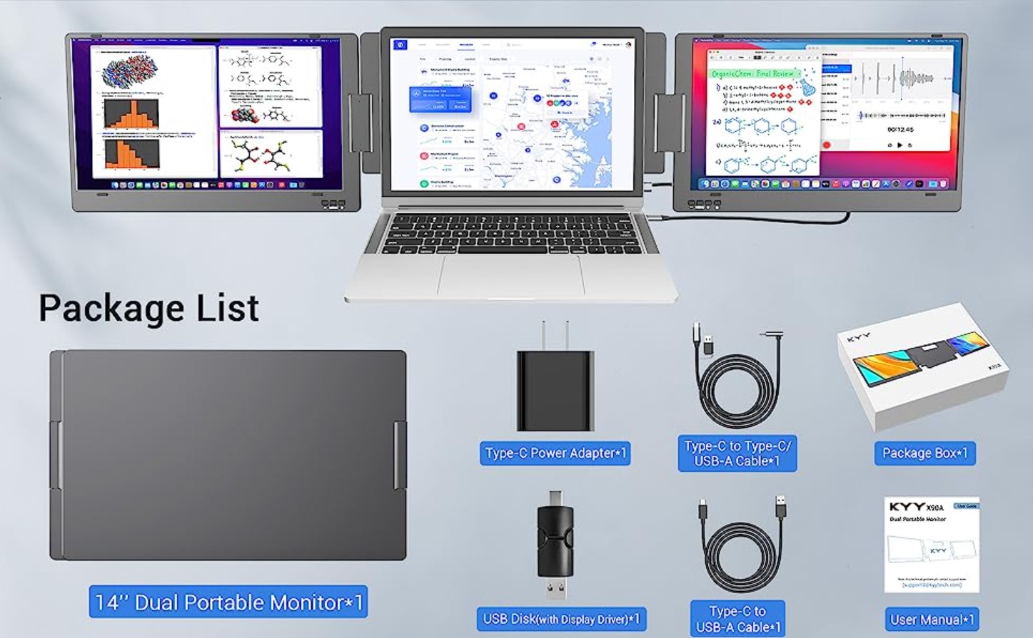 In this review, we will be taking a closer look at the KYY X90A monitor. This is a portable display consisting of two 14-inch screens with a resolution of 1,920 x 1,080 pixels each. In everyday use, your mobile workspace with a laptop can be expanded easily. At the same time, you can also place tablets up to 16 inches in size in the middle of the two screens. Both displays can be connected through one single USB-C cable and after a short setup, they are ready for action.