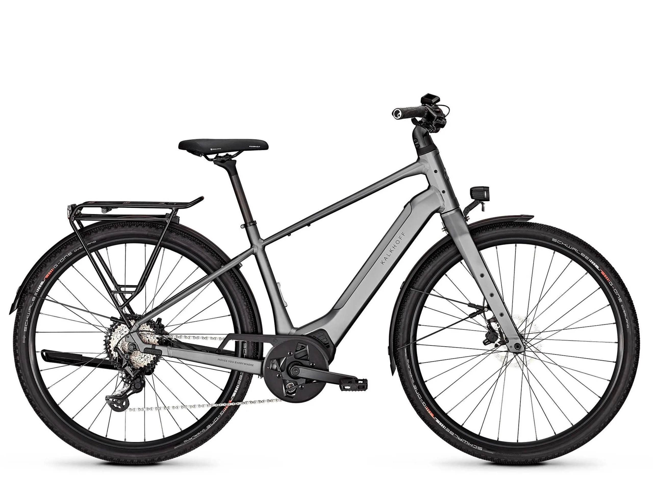 Both the headlights and the rear light are from Herrmans. A rear kickstand is available and mudguards are also included. Kalkhoff installs a Bosch Performance Line SX motor, which is somewhat more compact and lighter, since the torque is limited to 55 Newton meters, but this should not really be a major limitation in everyday use. A Bosch Purion 200 color display is mounted and the Bosch CompactTube battery has a capacity of 400 Wh. The e-bike is powered via a chain; the Shimano Deore XT derailleur system has 12 gears. There are 160 millimeter Magura MT30 hydraulic brake discs at the front and rear, which are intended to operate in all weather conditions and so can also brake very strongly in an emergency in wet conditions.