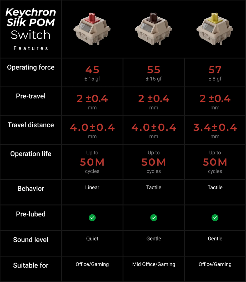 | Default switch options | Keychron Silk POM Red (linear), Brown (tactile), Banana (sharp tactile) | ||