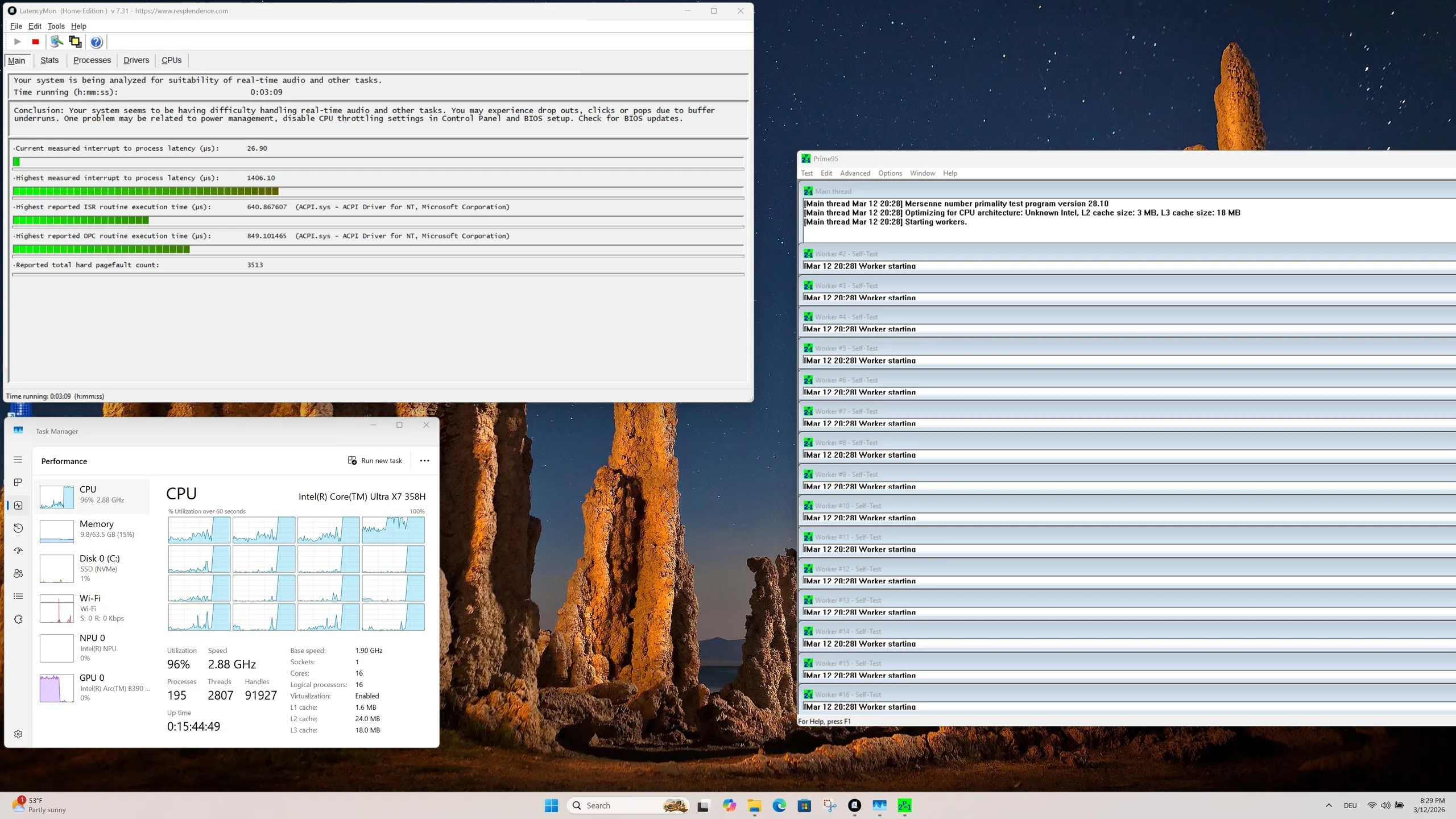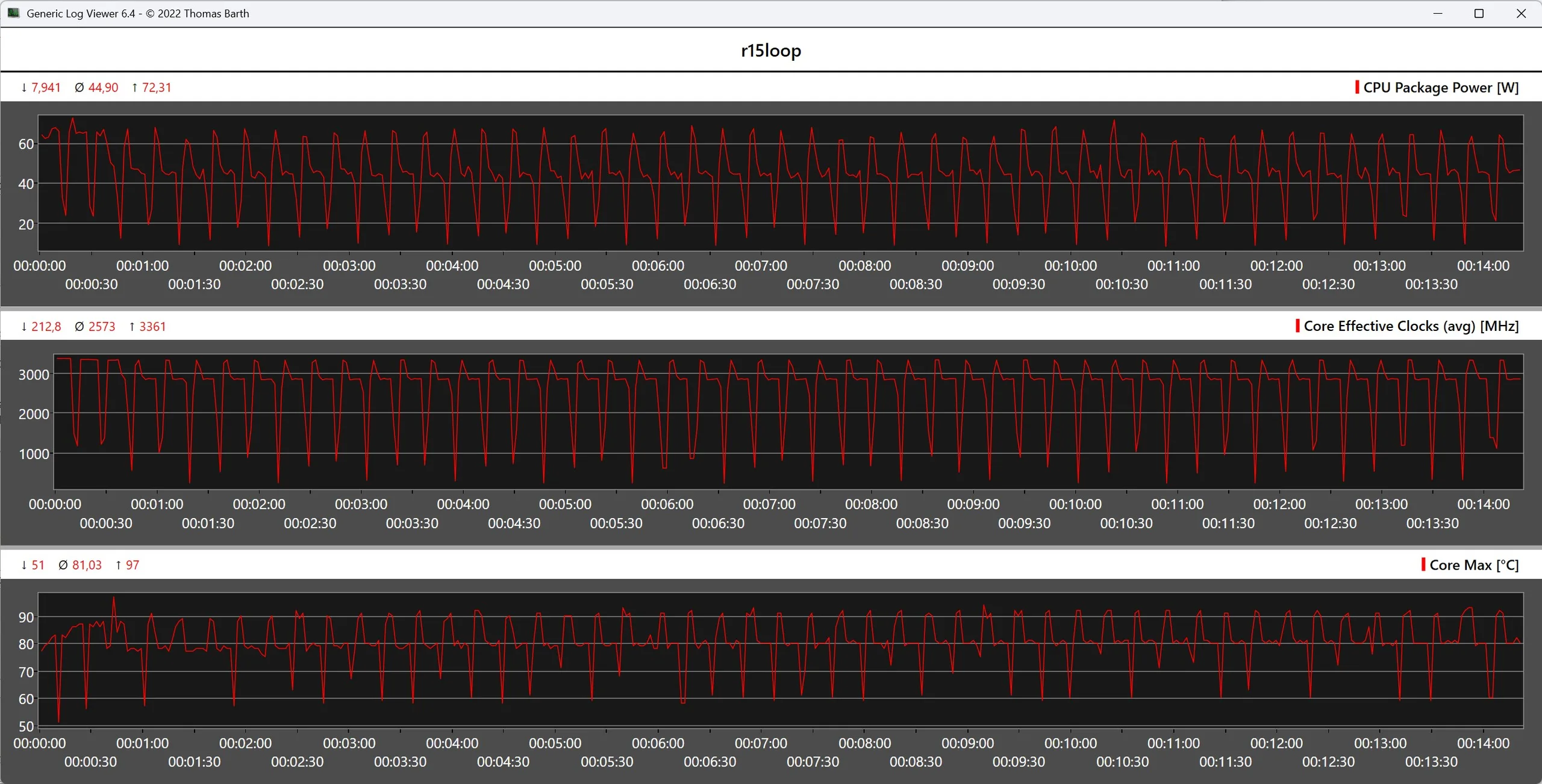 The performance of the Intel Core Ultra X7 358H drops slightly under sustained load, which can be easily observed in the Cinebench R15 multi-loop. On average, the processor works with a power consumption of around 45 watts, while the temperatures can rise to up to 97 C at the peak.