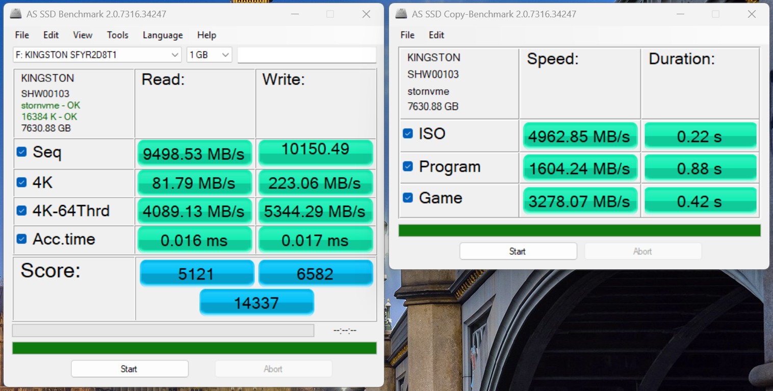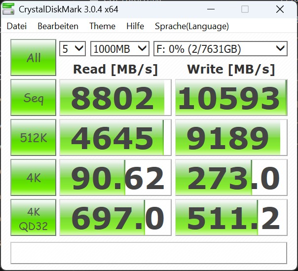 In our test system, the Kingston Fury Renegade G5 with 8 TB can almost fully exploit its enormous performance potential. In the CrystalDiskMark 6 benchmark, we measured sequential read rates of over 14,900 MB/s and write rates of around 14,200 MB/s. As expected, the results in the AS-SSD benchmark are somewhat lower. In a direct comparison with other internal high-end SSDs, the Fury Renegade G5 is clearly ahead of competitor models such as the Samsung 9100 Pro or the Kingston KC3000.