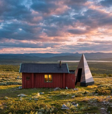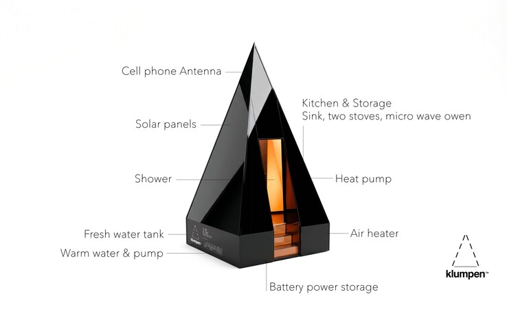The tent-shaped structure has an edge length of 2 meters and a height of 4.85 meters. The walls are fitted with photovoltaic panels. This energy is stored in three batteries with a total capacity of 7.5 kWh. Finally, the battery operates the other features of Klumpen, including a mobile phone modem and satellite broadband connection, so that a fast Internet connection should also be possible in remote locations.