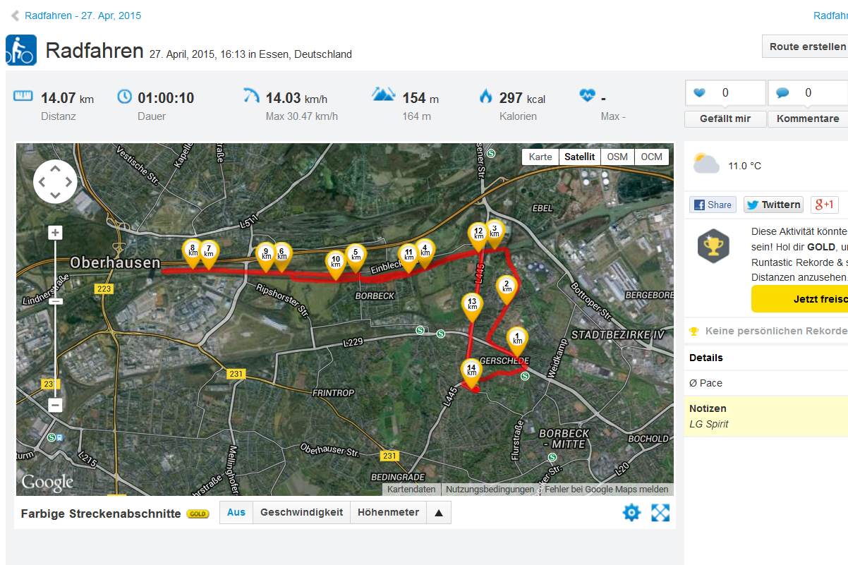 During this test, the measurements of our device were off by 10 meters at most (~33 feet / in comparison to the Garmin), which is quite good. When we were at the crossing of a train line, the Garmin eTrex 30 was far more accurate and the same is true when we drove along the river or in the forest. We found it annoying (but not surprising) that both navigation devices place us floating on the water instead of riding along the bank of the river. Overall, the GPS of the LG Spirit does a decent job, but, as expected, it cannot compete with a professional GPS in terms of accuracy.