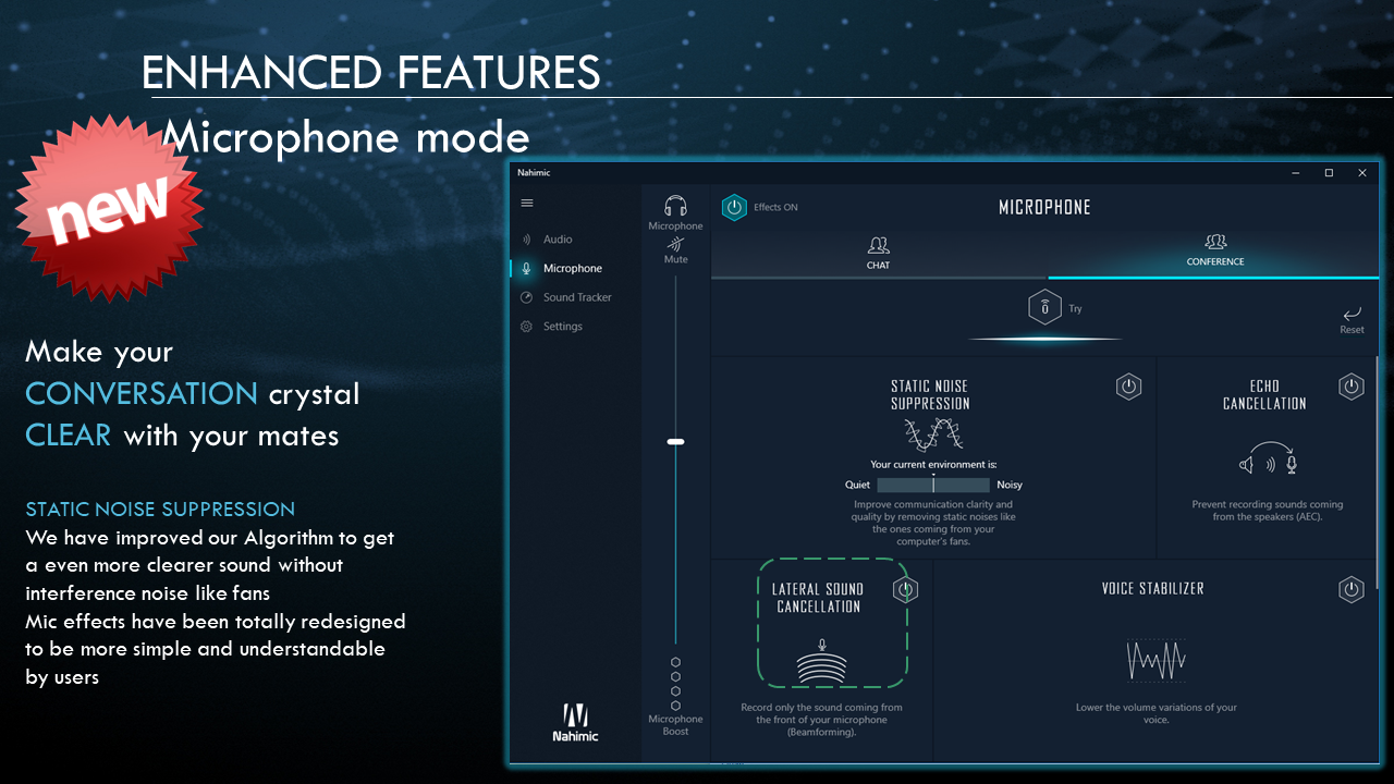 Delivering good noise cancellation algorithms is an integral part of headset design. Compared to other software audio-processing solutions such as Dolby Digital or Creative SoundBlaster Cinema, Nahimic offers an enhanced ability to add features such as voice level controls, noise gate adjustment, noise reduction, and beam-forming. So even if you are in the middle of a high-paced action game, Nahimic can discern your voice from background noise such as explosions or engine roars. The software is tuned by simulating specific environments in a lab and adjusted for high precision in noise cancellation.