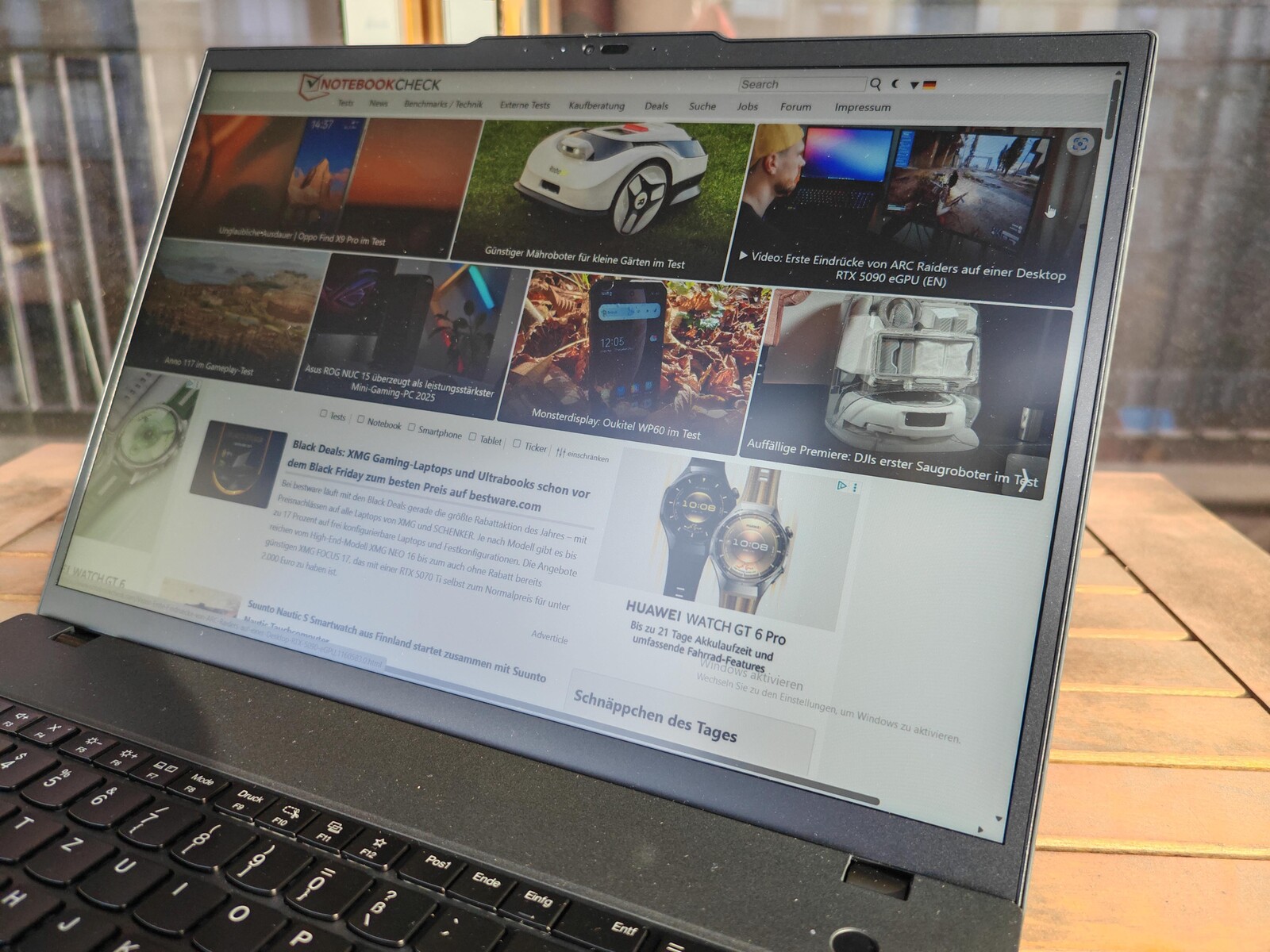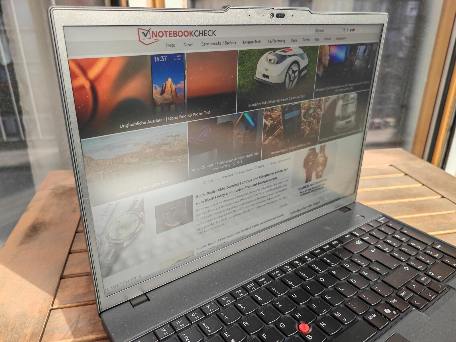 The matte Full HD panel (IPS, 1,920 x 1,200 pixels) in the LowPower version is installed in our test device. The subjective picture quality is good and the colors are vibrant, and even bright surfaces do not appear grainy. There are also no problems with PWM flickering and the response times are acceptable, although the panel only supports 60 Hz. Overall, however, it is well suited for working.