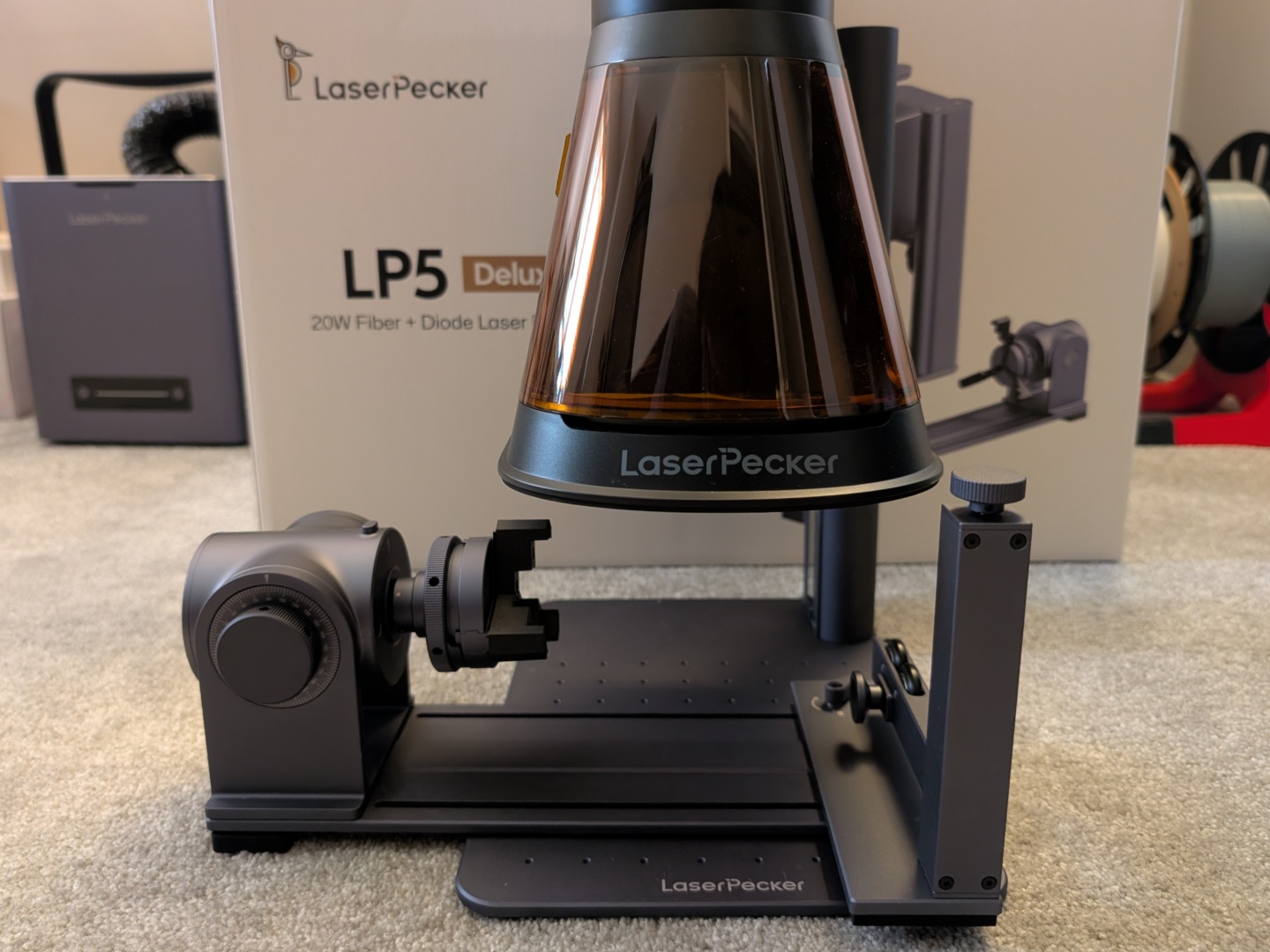 The build quality of the LP5, as well as the accessories, is excellent. Everything feels premium and solid. All the LaserPecker portable laser engravers (LP series) have a color theme which extends to the accessories as well, including the safety enclosure and air purifier. Setting up the LP5 itself is just screwing in the base plate, the stand, laser unit, and the conical cover. As mentioned earlier, the manuals and videos make things easier. Using the safety enclosure, which also powers the laser unit, requires screwing the laser unit on top with just two screws. One of the pipes can be used to connect the exhaust port on the enclosure to the intake of the air purifier, making indoor use safer.