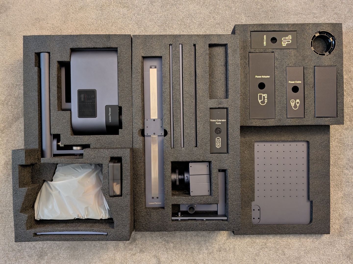 With precise foam cutouts and labelled boxes, LaserPecker has packaged the LP5 very well. Everything has its designated place so in case you want to pack it all up and move, keep the box it comes in. The LP5 itself is packed into three separate parts that are easy to assemble. Safety goggles are included in the package, along with all the cables, pipes, and the power adapter.