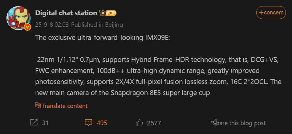 Reportedly, the Sony IMX09E features 0.7 μm wide pixels with a 1/1.12-inch optical format. In other words, the sensor would be smaller than the LYT-900. To offset this, Digital Chat Station believes that the IMX09E will provide over 100 dB of dynamic range using Sony's Hybrid-Frame HDR technology. On top of that, the IMX09E should be capable of offering a 4x lossless zoom experience paired with Qualcomm's next-generation Snapdragon 8 Elite chipset.