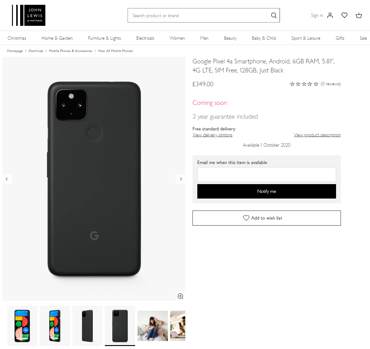 A UK retailer has inadvertently leaked the design of the Google Pixel 4a (5G) ahead of the device's September 30 announcement. Roland Quandt has already reported that the Pixel 4a (5G) will have a 6.2-inch screen, along with a Snapdragon 765G chipset, 6 GB of RAM and 128 GB of storage. Now, John Lewis has effectively confirmed most of Quandt's assertions plus offered us a first look at the upcoming device.