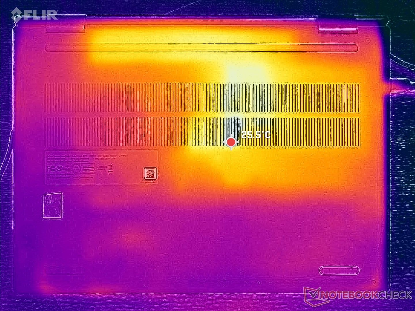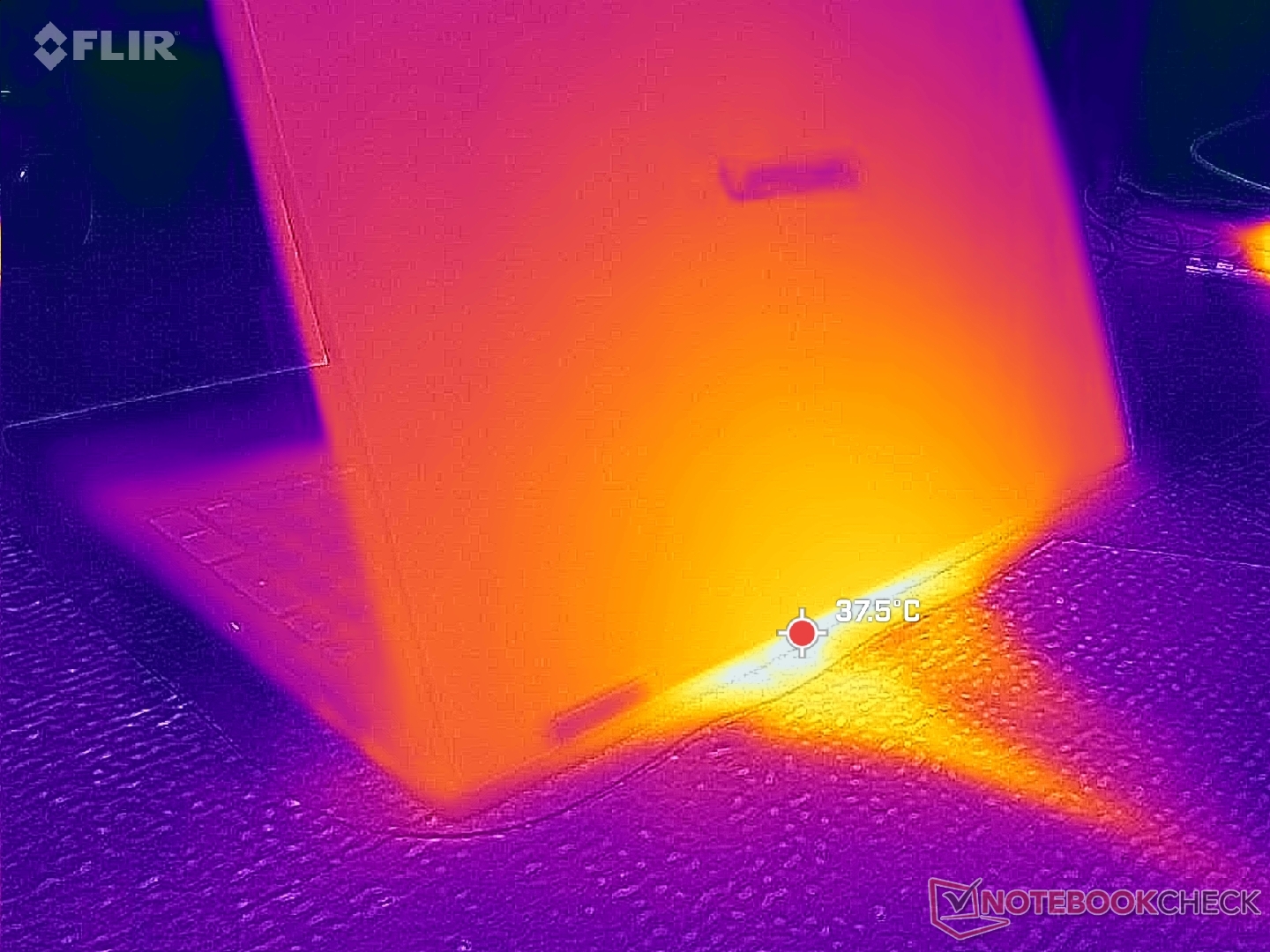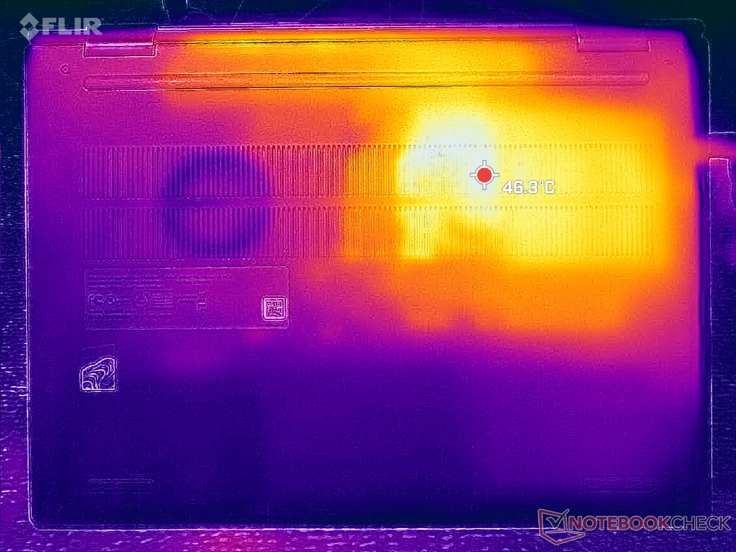 The left half of the chassis will always be warmer than the right where hot spots can reach over 40 C when running demanding loads for long periods. While the temperature difference can be noticeable, we never found the surfaces to be uncomfortably warm during use.
