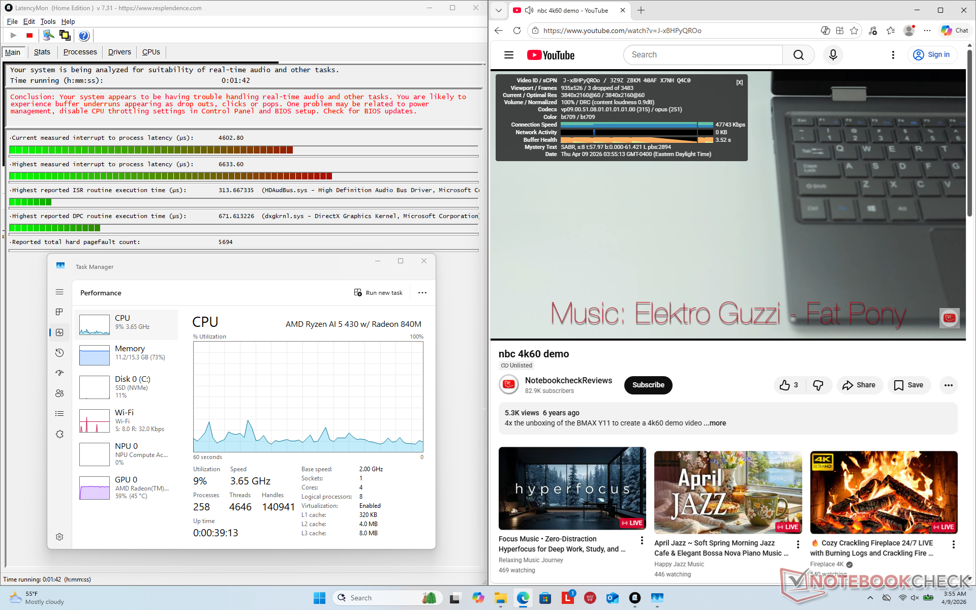 The processor would stabilize at 3 GHz, 30 W, and 58 C when running Prime95 stress. CPU package power may reach as high as 47 W only during the start of the test as shown by the screenshots below. Core temperatures when running demanding loads are cooler than what we recorded on the Intel-powered IdeaPad Slim 3 15IRH10R by about 10 C to 15 C.