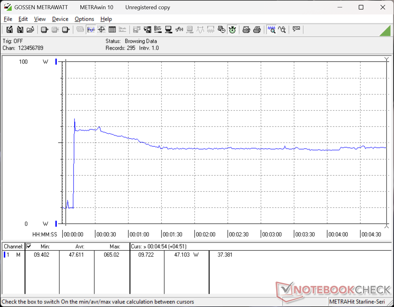 The system can draw the entire 65 W output of the small (9 x 4.6 x 2.7 cm) USB-C AC adapter when the CPU is fully stressed, but this is only temporary as shown by the graph below.