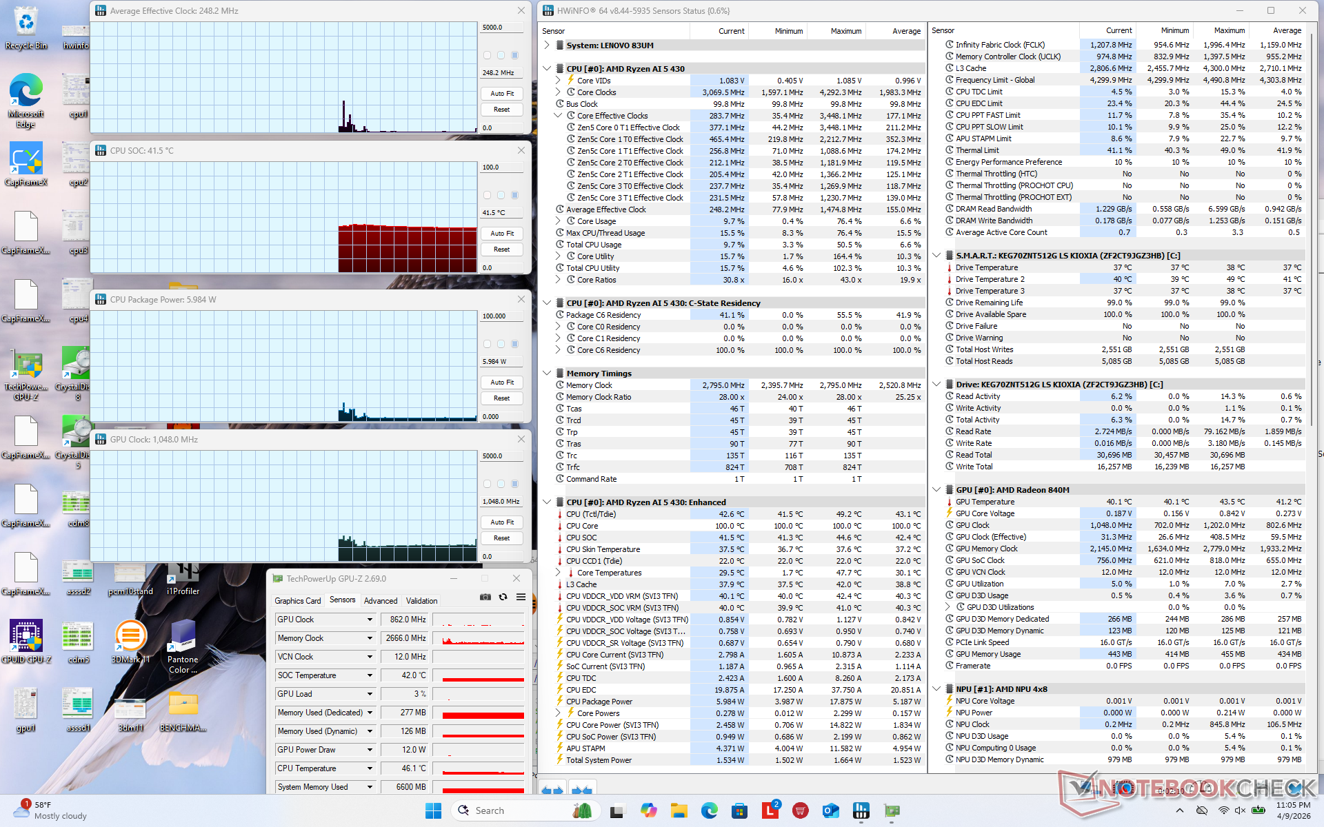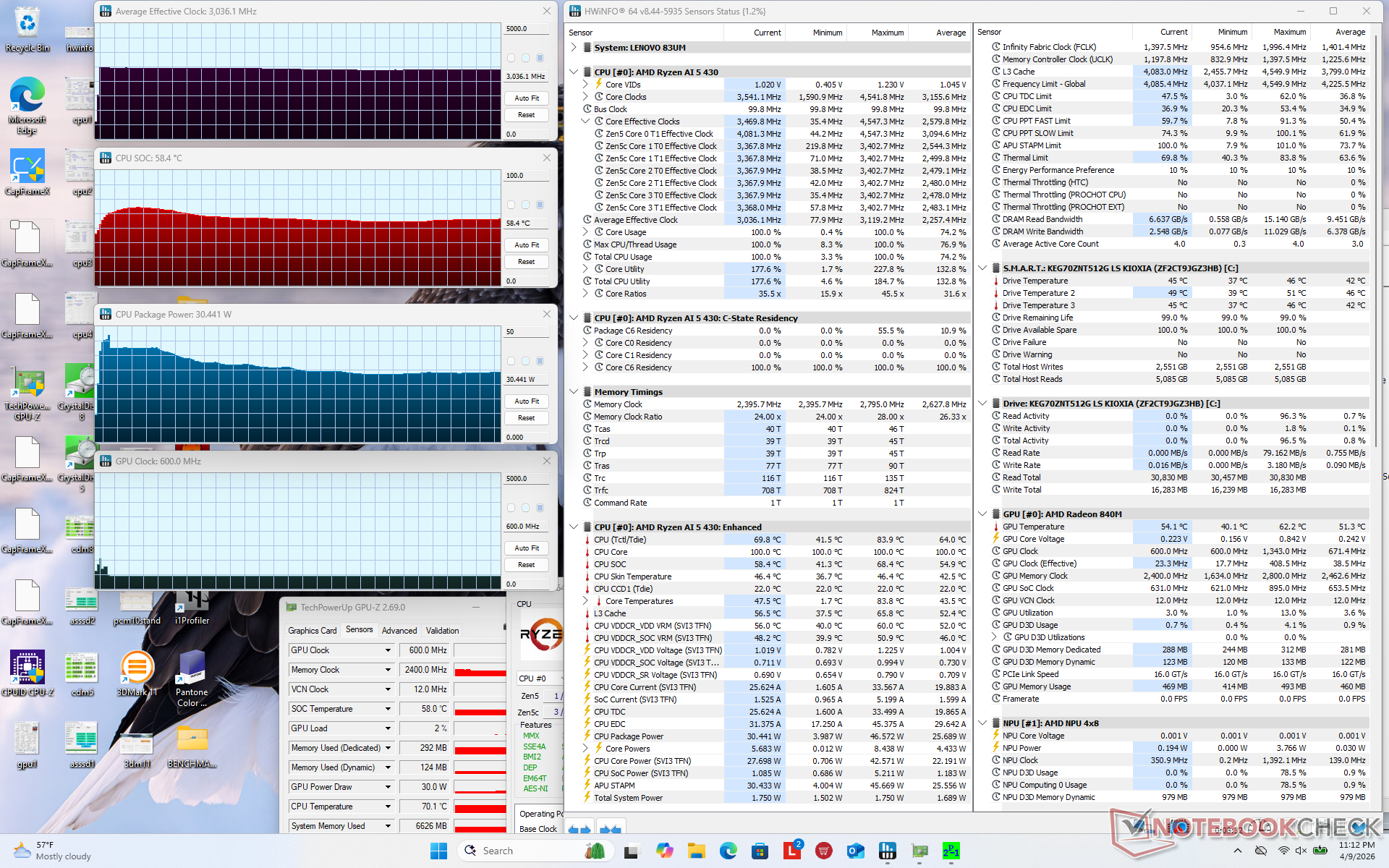 | Average CPU Clock (GHz) | GPU Clock (MHz) | Average CPU Temperature (°C) | |