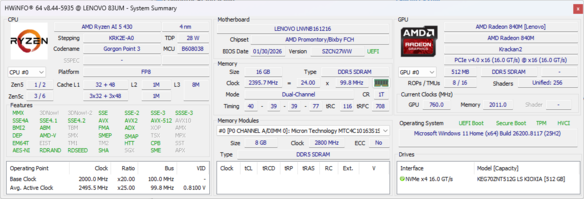 | Lenovo IdeaPad 5 2-in-1 15AGP11 Ryzen AI 5 430, Radeon 840M, , IPS, 1920x1200, 15.3" | Lenovo IdeaPad Slim 3 15IRH10R Core 5 210H, UHD Graphics Xe G4 48EUs, Micron 2500 1TB MTFDKBA1T0QGN, IPS, 1920x1200, 15.3" | HP 250 G9 7N029ES i3-1215U, UHD Graphics 64EUs, SK hynix HFS512GEJ9X125N, IPS, 1920x1080, 15.6" | Asus ExpertBook B1 BM1503CDA-S70031X R5 7535U, Radeon 660M, Western Digital PC SN5000S SDEQNSJ-512G-1002, IPS, 1920x1080, 15.6" | Eurocom C315 Blitz i7-1360P, Iris Xe G7 96EUs, Samsung 990 Pro 1 TB, IPS, 3840x2160, 15.6" | LG Gram 15U55T Ultra 7 255U, Graphics 4-Core iGPU (Arrow Lake), , IPS, 1920x1080, 15.6" | |