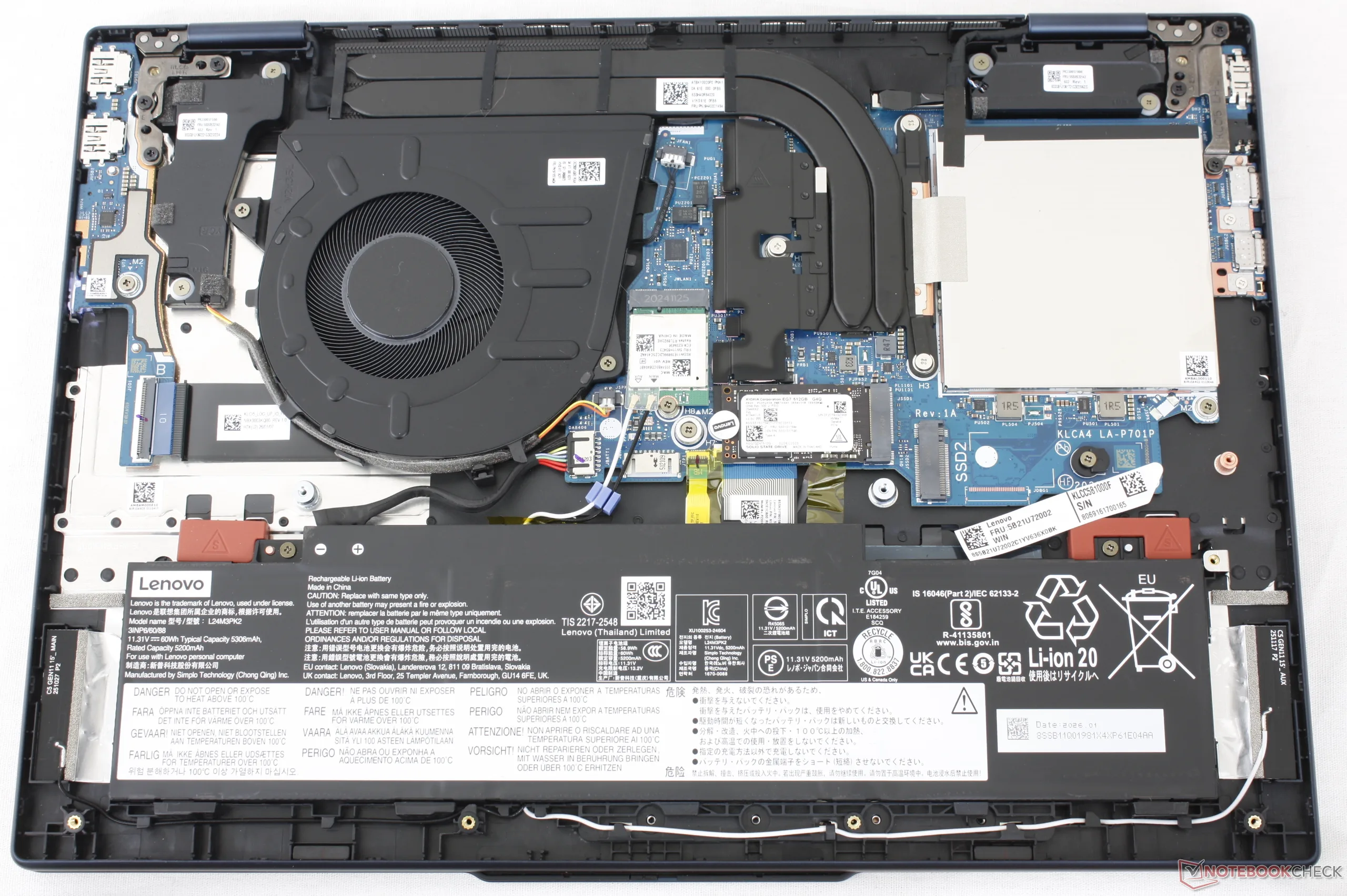 The chassis consists of aluminum on the top and ABS-GF or glass-fiber-reinforced plastic for the bottom for solid first impressions considering the entry-level price. However, the unibody color is visually dull and the base flexes a bit more easily when compared to a higher-end Yoga Pro or Yoga 7 alternative.