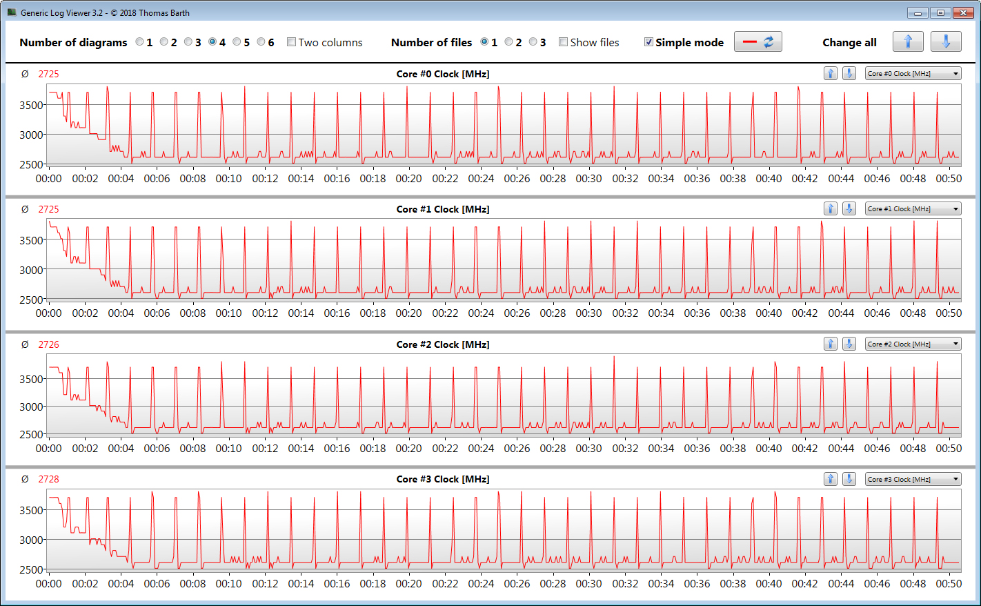 We test whether Turbo is also used consistently by running Cinebench's R15 multithread test continuously in a loop for a about 30 minutes. Turbo is used, but to a different extent in each run. The diagram illustrates the uneven performance development.