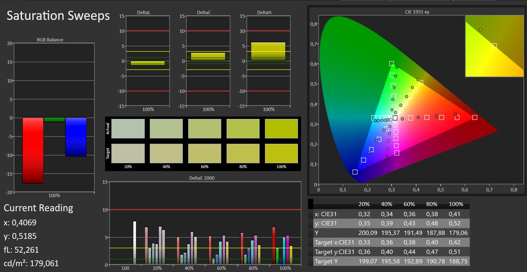 | Colorchecker dE 2000 * | 5.23 | 5.34 -2% | 1.3 75% | 2.8 46% | 4.33 17% | 1.2 77% | 1.8 66% |