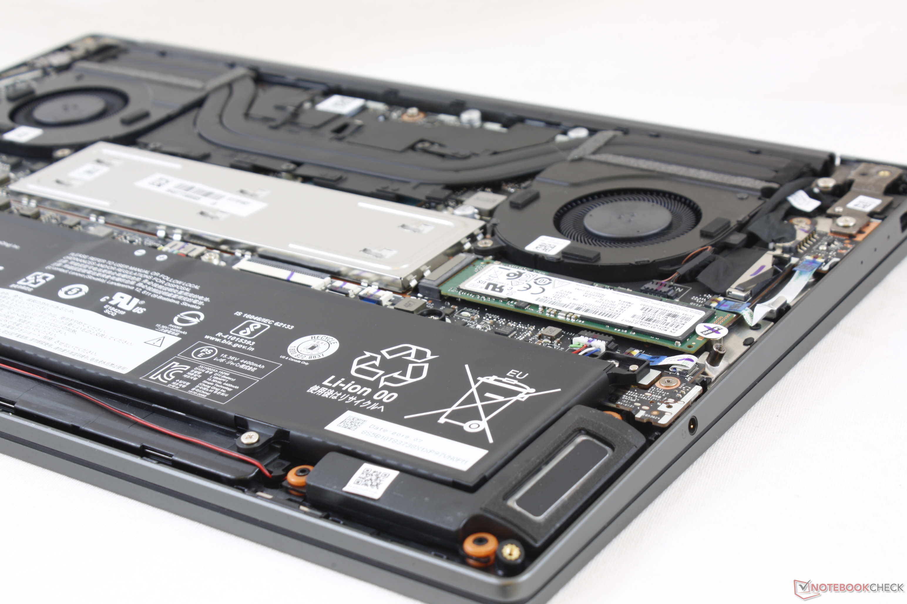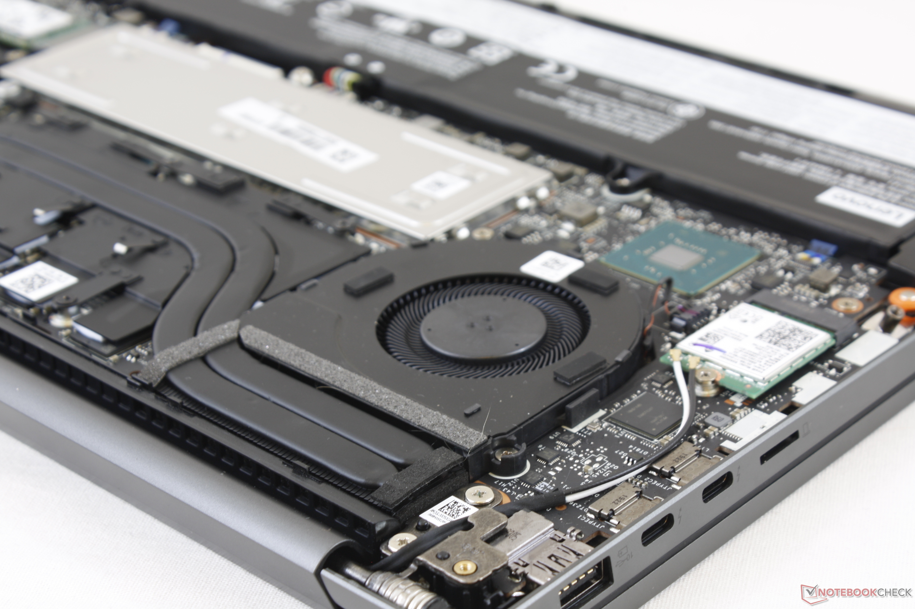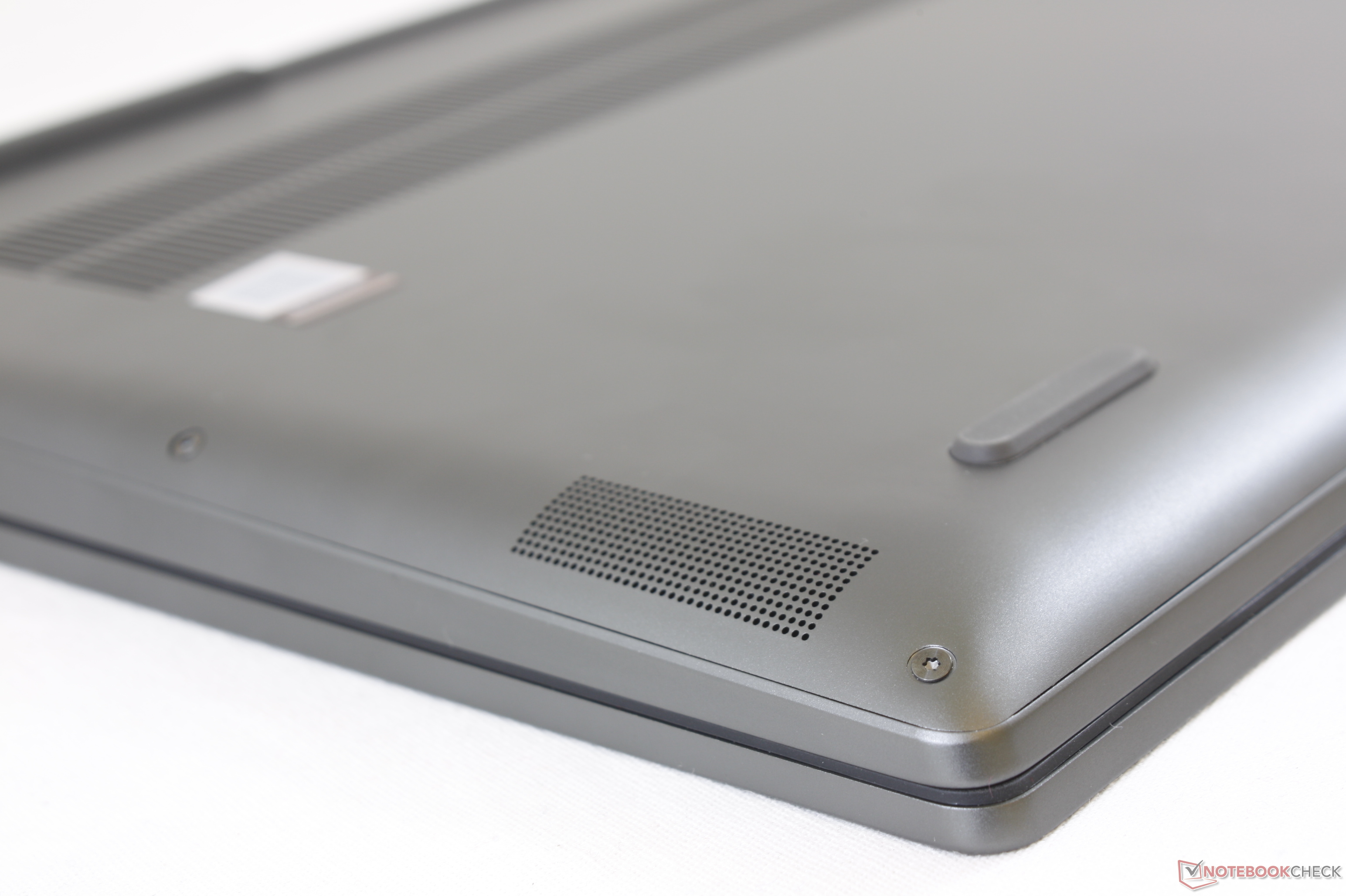 The bottom panel is secured by eight T5 Torx screws with none hidden underneath the rubber footing. Be aware that the edges of the panel are both sharp and tightly latched. Once inside, users can upgrade the WLAN, M.2 SSD, and both SODIMM slots protected under the aluminum plate.