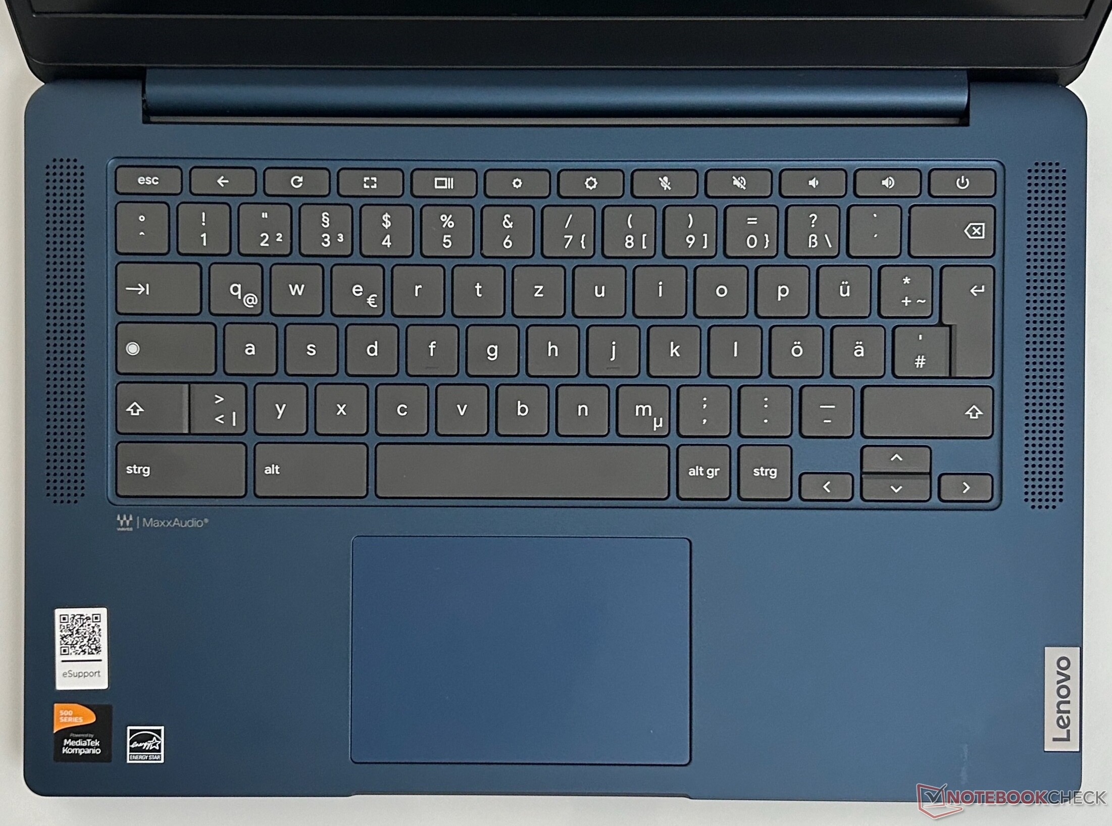 The IdeaPad's keyboard features the standard layout for ChromeOS laptops. The individual chiclet keys are 15.5 x 15.2 mm in size and offer a sufficient lift of 1.4 mm. If you aren't used to a Chromebook, then you might have to get used to the short distance separating the Enter and "#" keys. Apart from this, the layout is comfortable. Haptically, the individual keys feel a little cheap and tend to rattle a bit. The author of this article managed to type fast on this keyboard (92 words per minute) and without any mistakes.
