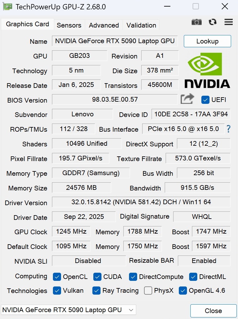 | Alienware 18 Area-51 Intel Core Ultra 9 275HX ⎘ Nvidia GeForce RTX 5090 Laptop ⎘ 64 GB Memory | Amazon: $3,432.44 List Price: 4400 USD | 4.2 kg | 24.32 mm | 18.00" 2560x1600 168 PPI IPS | |