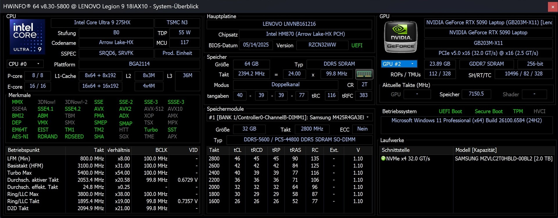 | Lenovo Legion 9 18IAX10 RTX 5090 Intel Core Ultra 9 275HX ⎘ Nvidia GeForce RTX 5090 Laptop ⎘ 64 GB Memory, 2000 GB SSD | Amazon: 1. $3,549.00 Lenovo Legion Pro 7i Gen 10 ... 2. $3,549.00 Lenovo Legion Pro 7i Gen 10 ... 3. $3,269.99 Lenovo Legion Pro 7i Gen 10 ... List Price: 5900 EUR | 3.5 kg | 28 mm | 18.00" 3840x2400 252 PPI IPS | |