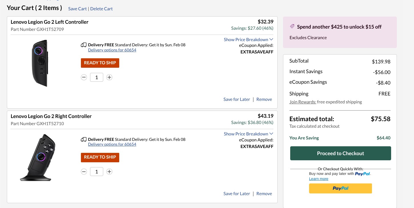When you add both controllers to your cart, Lenovo also applies a coupon that knocks off an extra $8.40, bringing the total price to $75.58 instead of $139.98. This means you get to save over $60.