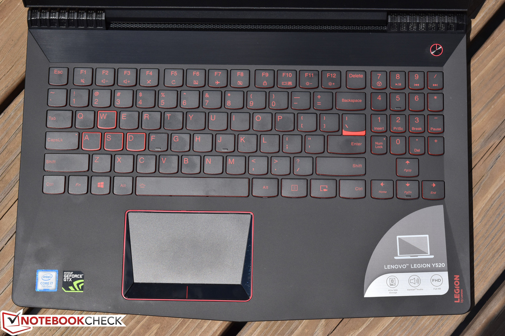 The Y520’s keyboard features well-sized and spaced keys with a comfortable smooth surface (which is unfortunately as much of a fingerprint magnet as the rest of the casing materials). The oversized arrow keys feature an extended width to better accommodate gaming usage, though the number pad on the right side is, oppositely, a bit cramped due to its reduced width. The keys overall operate with a medium stroke and a comfortable sense of feedback. They’re also relatively quiet. The only criticism is the visibility of the key labels, which are colored red against a black background—not the best contrast. Fortunately, backlighting does remediate this problem in lower-light conditions.