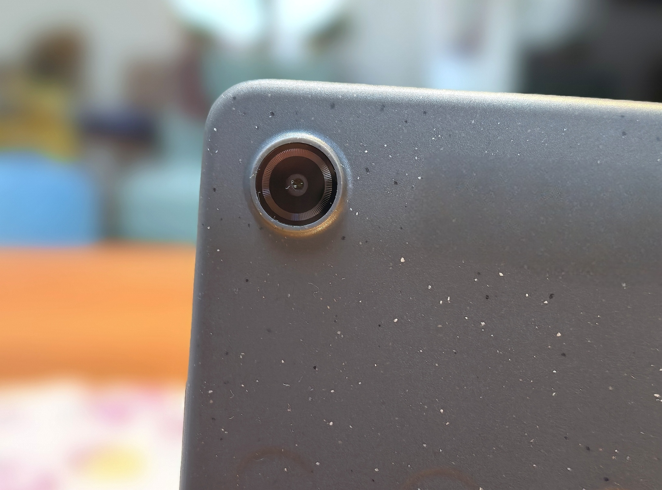 The Lenovo Tab K9 is available in business-compatible gray. It has small speckles of differently-colored plastic, which is due to the fact that Lenovo uses 35% recycled material here. Together with the circular pattern on the back, this creates an interesting look reminiscent of terrazzo flooring.