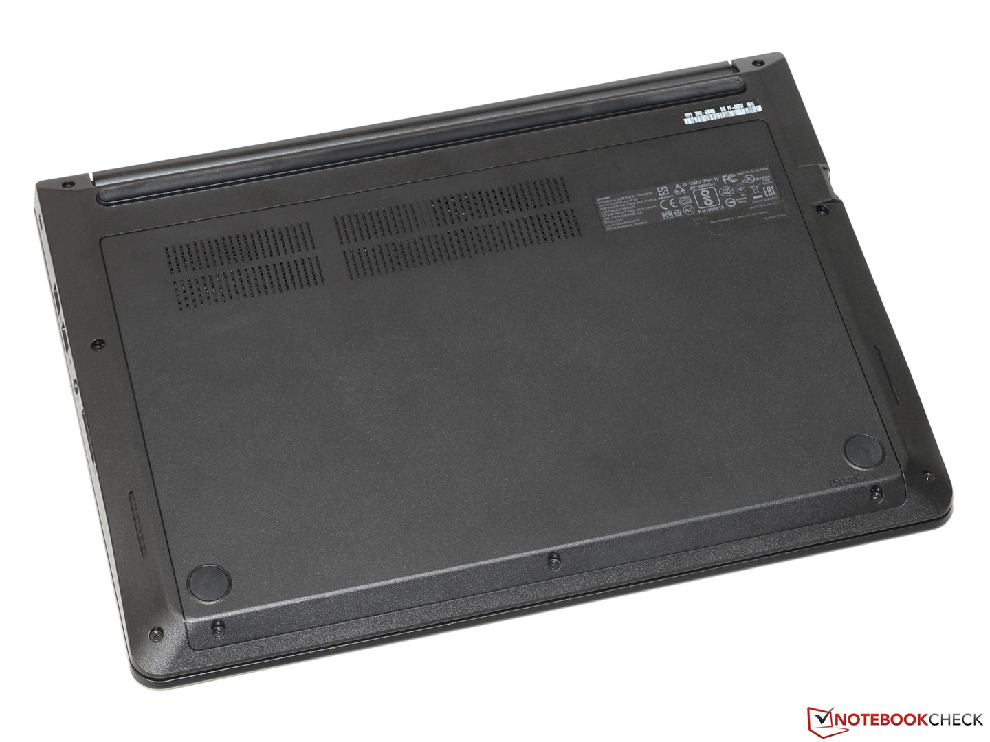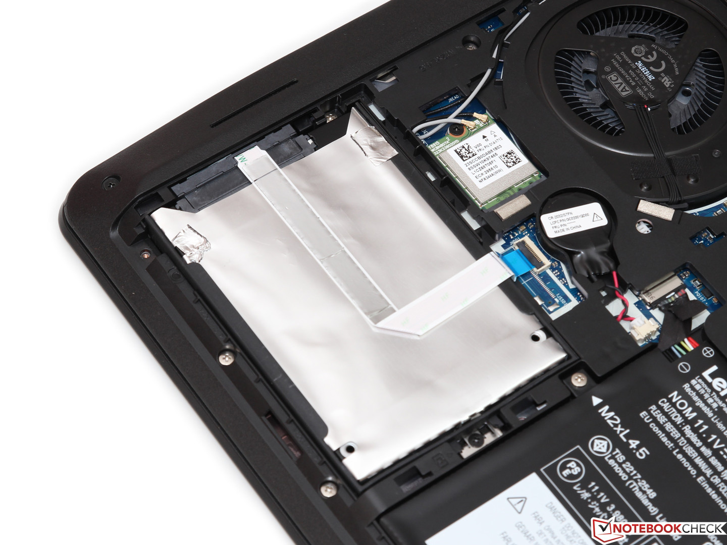 After removing three screws, the user can take off the bottom of the laptop. Sadly, there are not that many upgrade options for the test model: a free memory slot would offer support for another DDR4 module. Other slots are occupied (1x M.2/E-Key for WLAN, 1x 2.5" SSD). We expected at least 1 or 2 additional M.2 slots for further SSDs or an LTE module (like many competitors offer). We like the battery (screwed in but still removable) and the accessible fan (for cleaning).