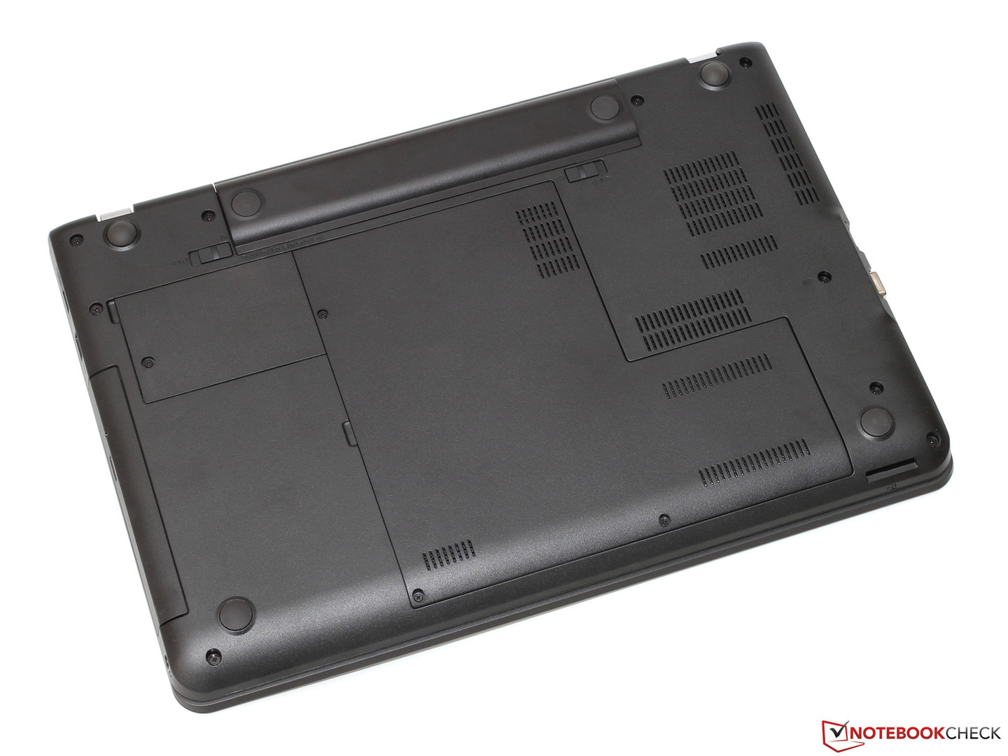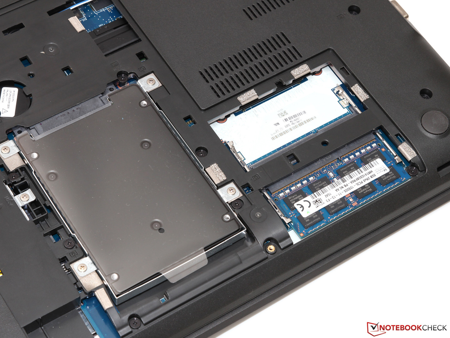 You can open the two maintenance hatches after the removal of four screws in total and gain access to the WLAN module, the two memory slots (one free) as well as the 2.5-inch drive. You would have to disassemble the device further for access to the fan and the cooling solution, but only experienced users should do that. Also unfortunate: Due to the lack of a free M.2 slot, you cannot use an additional SSD or a combination of SSD and HDD – the rival HP ProBook 450 G3 is superior in this respect.
