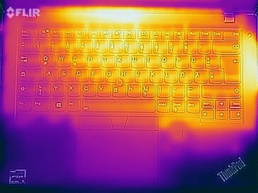 Overall, the ThinkPad L14’s temperatures around the keyboard area were better than its L490 predecessor’s with Whiskey Lake that tended to reach up to 46 °C in the top right corner. In comparison, our AMD-powered review unit peaked at 43 °C. Unfortunately, temperatures around the palm rests are around 7 °C higher than on the L490. The L14’s hot spot is located at the bottom rear where it peaked at around 50 °C – too hot for lap use.