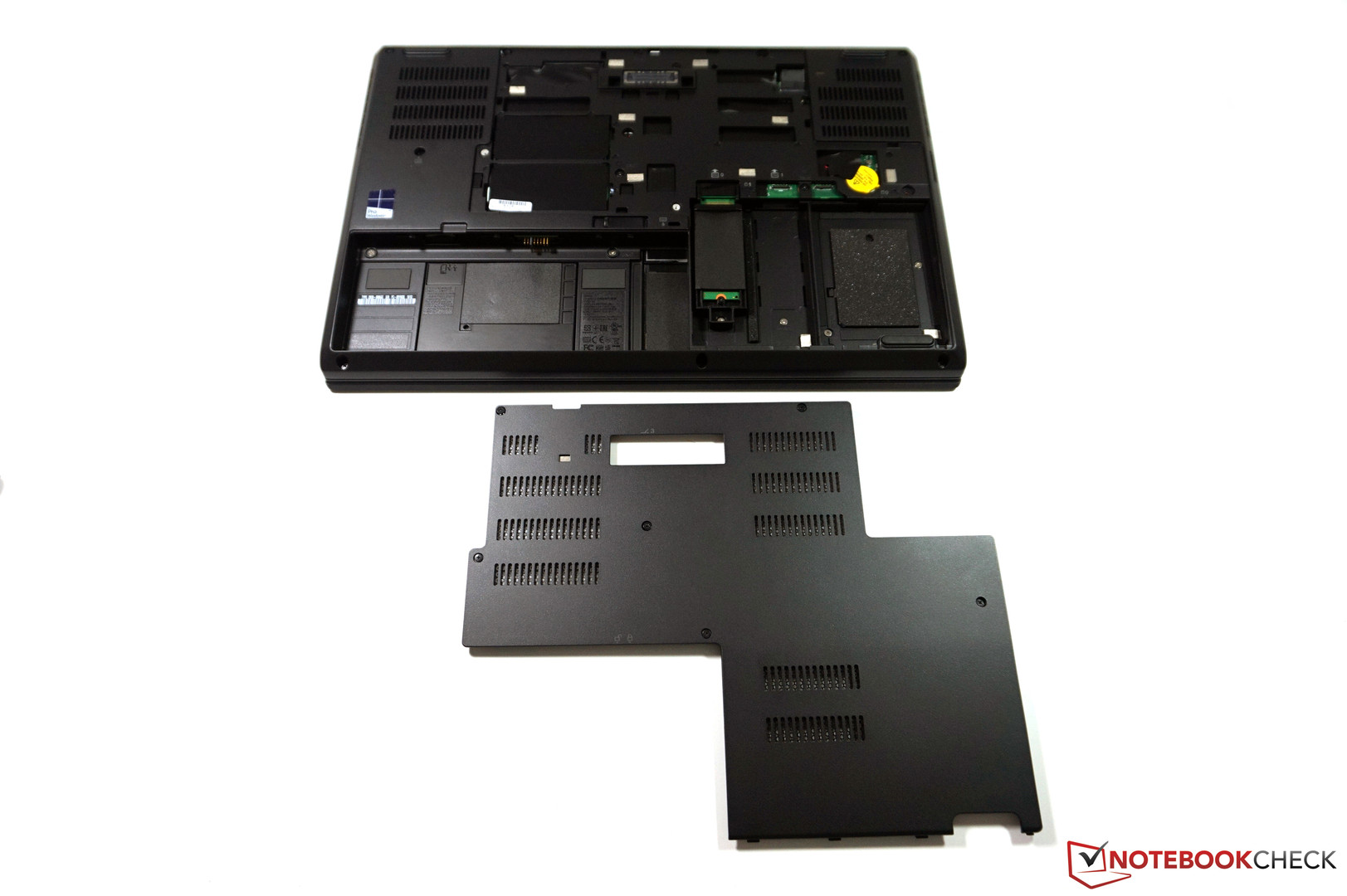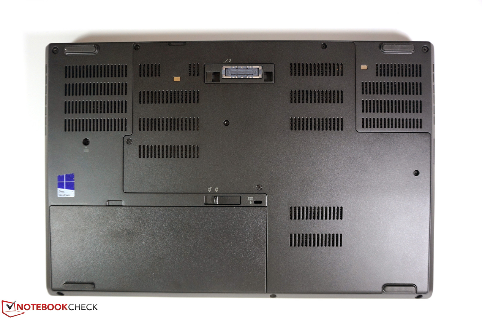 The battery is located at the front of the base unit and can easily be removed, but one of the support feet is located on the battery. This means you will have to live with a tilting notebook if you want to use it without the battery. At the bottom is a large maintenance hatch, which is only secured by a couple of screws.