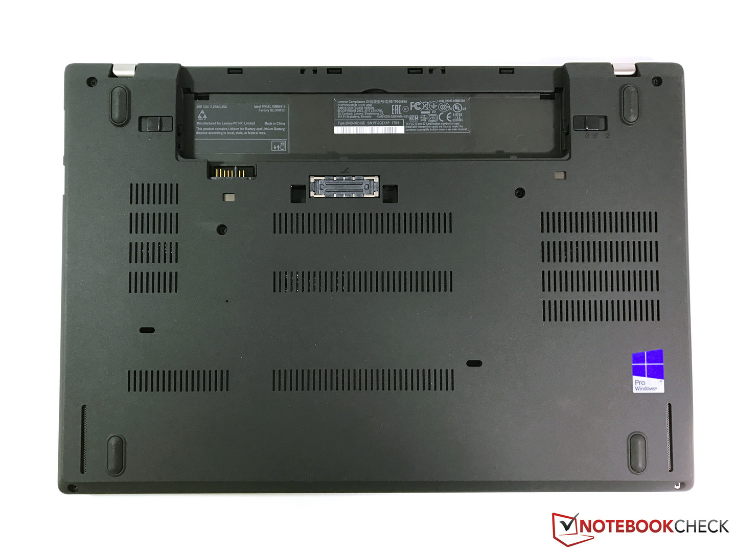 Overall, both the stability and the build quality are very good, but, which is no surprise, not quite on par with high-quality unibody metal constructions. One advantage of the T470, however, is the external battery (total of two batteries), which is easily accessible at the back. It is located in the center and does not have a support foot, so the device is very stable on a desk even when you remove the battery. There are no dedicated maintenance hatches, but you can remove the whole bottom cover to access the components (more on that later).